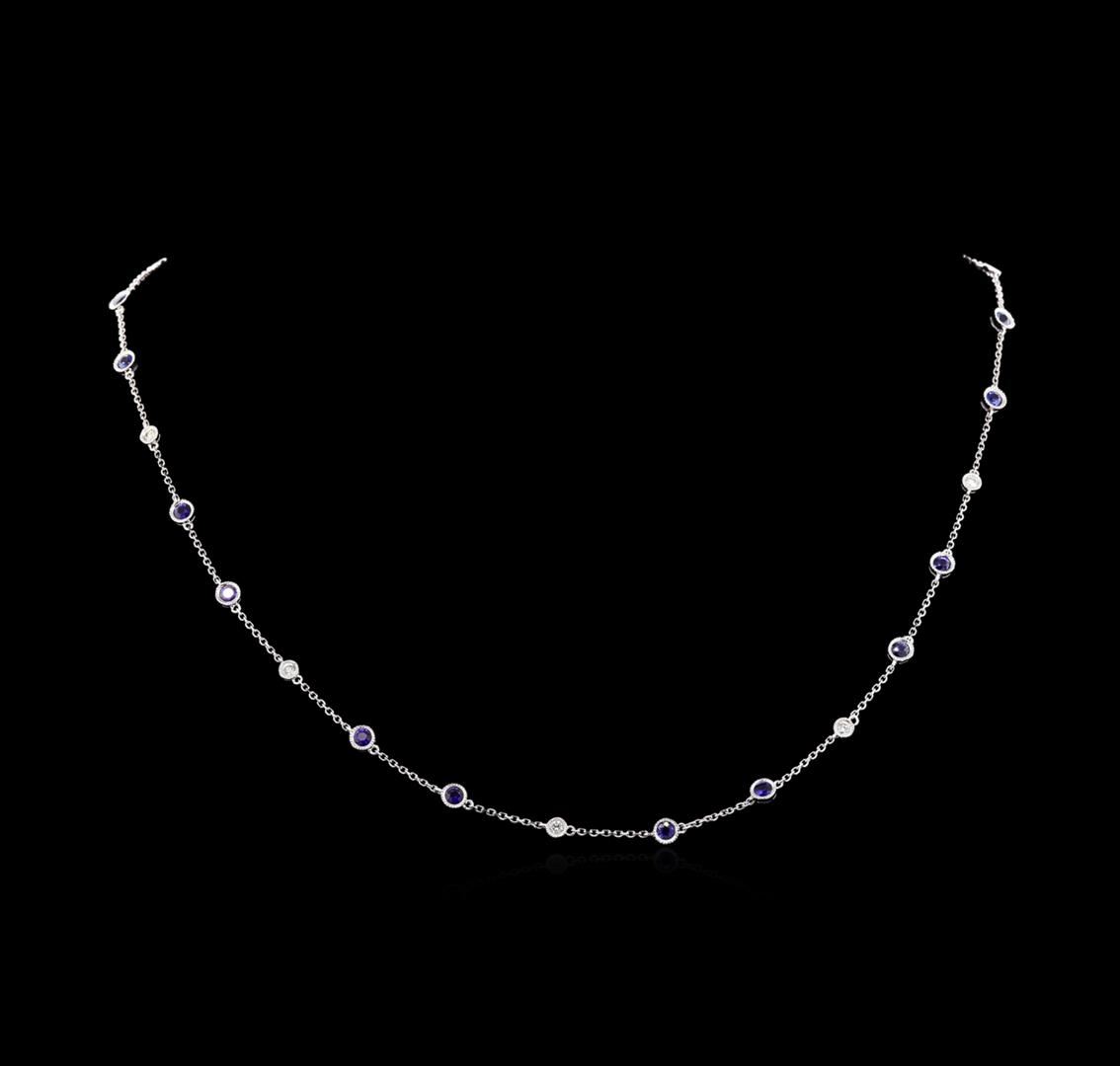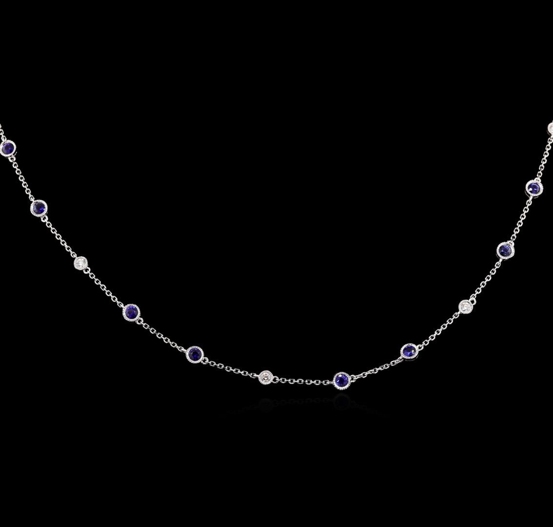 One electronically tested 18KT white gold lady's combination cast & assembled diamonds by the yard necklace with a lobster claw clasp with a bright polish with milgrain detailing finish. The featured lady's necklace has a 1.4mm wide diamond cut cable link chain and measures 25 inches in length. Trademark is MICHA. Identified with markings of "18K 750". Condition is new, good workmanship. Containing: Twenty bezel set round modified brilliant cut natural blue sapphires, measuring 3.20 - 3.10 x 2.04 mm, approximate total weight of 3.36ct., clarity is eye clean, type II, medium dark, moderately strong, violetish blue color, (GIA vB 6/4), cut is very good. Colored gemstones are presumed to have been subjected to commonly used enhancement processes. Graded in the setting. Twelve bezel set round brilliant cut diamonds, measuring 2.60 - 2.50 x 1.53mm (depth est.) approximate total weight of 12 Stones = 0.72ct. Graded in the setting. Clarity: SI-1 to SI-2. Color: H - I. Cut Good. Total Weight of Colored Stones 3.36ct. Total Weight of Diamonds 0.72ct. Total Weight of Necklace 12.90gm. GAS Appraised at $8,430.00.