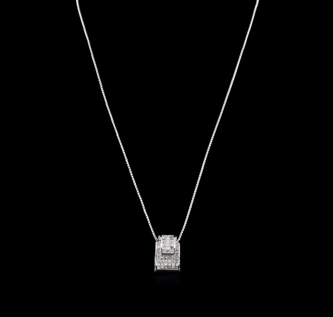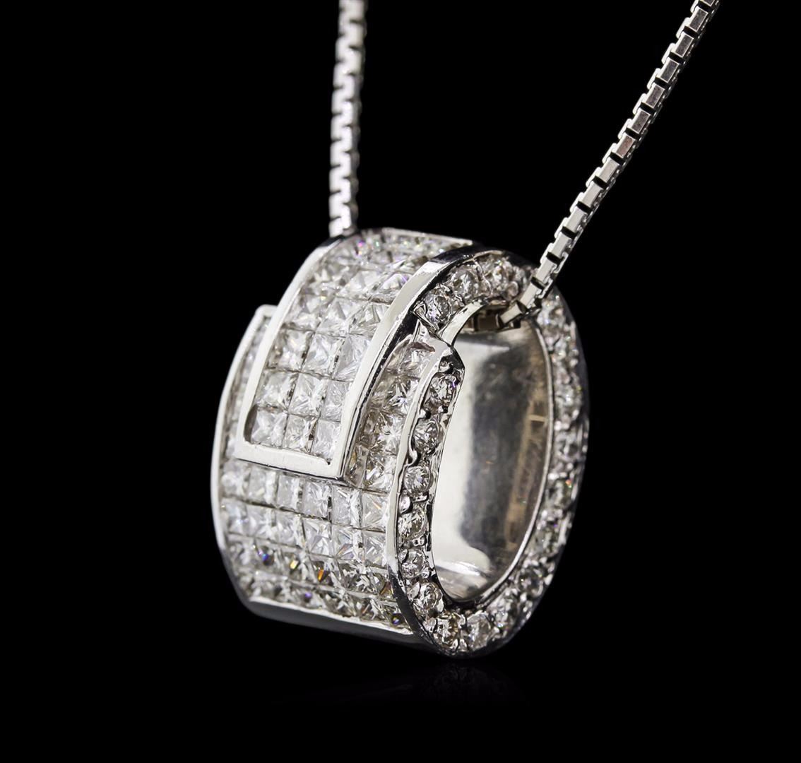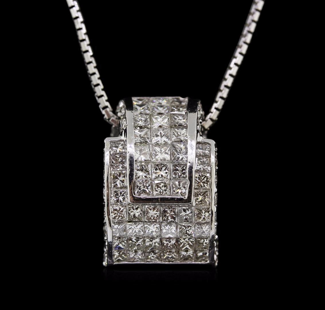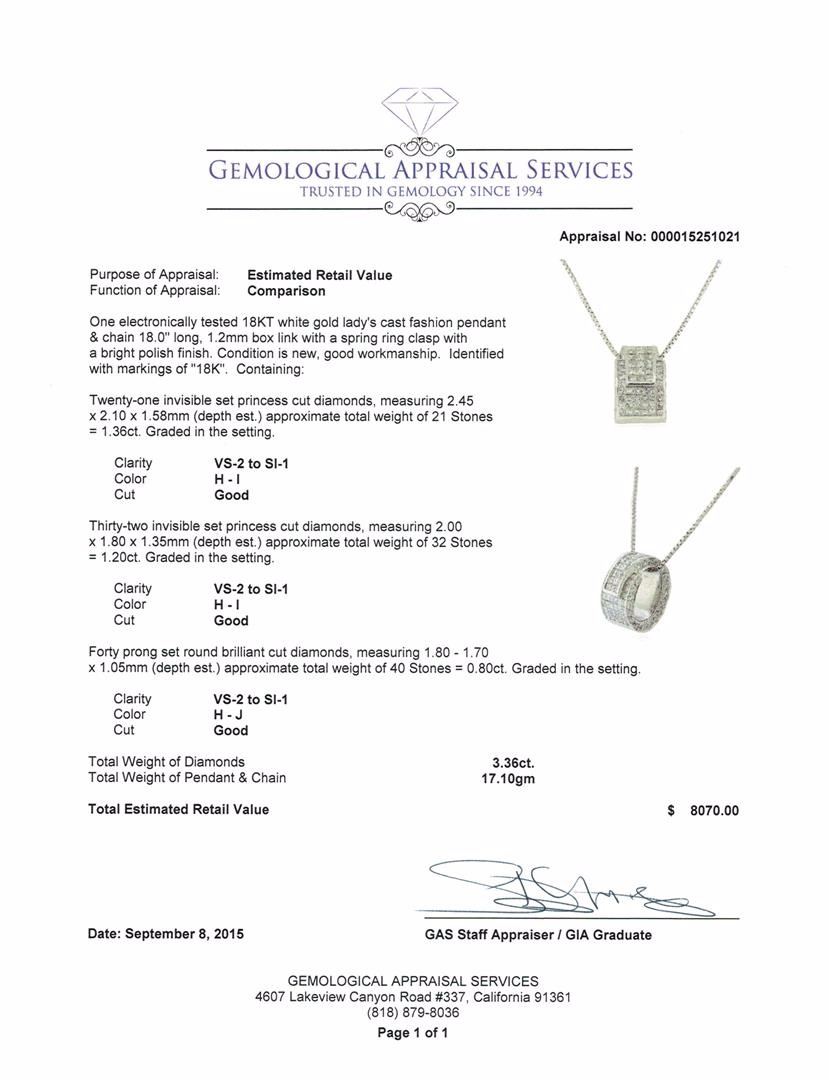 One electronically tested 18KT white gold lady's cast fashion pendant & chain 18.0" long, 1.2mm box link with a spring ring clasp with a bright polish finish. Identified with markings of "18K". Condition is new, good workmanship. Containing: Twenty-One invisible set princess cut diamonds, measuring 2.45 x 2.10 x 1.58mm (depth est.) approximate total weight of 21 Stones = 1.36ct. Graded in the setting. Clarity: VS-2 to SI-1. Color: H - I. Cut Good Thirty-Two invisible set princess cut diamonds, measuring 2.00 x 1.80 x 1.35mm (depth est.) approximate total weight of 32 Stones = 1.20ct. Graded in the setting. Clarity: VS-2 to SI-1. Color: H - I. Cut Good Forty prong set round brilliant cut diamonds, measuring 1.80 - 1.70 x 1.05mm (depth est.) approximate total weight of 40 Stones = 0.80ct. Graded in the setting. Clarity: VS-2 to SI-1. Color: H - Good. Total Weight of Diamonds 3.36ct. Total Weight of Pendant & Chain 17.10gm. GAS Appraised at $8,070.00.