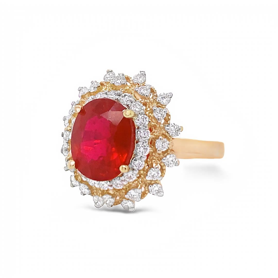 DESCRIPTION: ONE 14K YELLOW GOLD LADY'S CUSTOM MADE DIAMOND and TREATED RUBY RING. 4.50 GR TW #1 - MAIN GEMSTONE:# IDENTITY: ONE CENTER TREATED RUBY SET IN PRONGS SETTING CARAT WEIGHT: 3.37 CTS SHAPE and MEASUREMEMT: OVAL CUT QUALITY: DEEP RED, ENHANCED Q