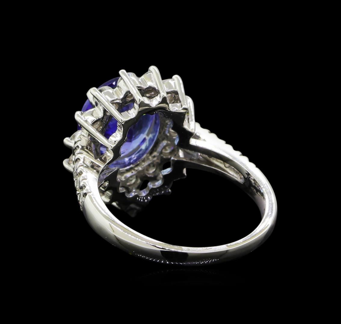 One electronically tested 14KT white gold lady's cast fashion ring with a basket halo with a bright polish finish. The featured lady's ring has a shank measuring 1.90 millimeters wide. Identified with markings of 'K14'. Condition is new, good workmanship. Containing: One prong set oval modified brilliant cut natural tanzanite, measuring 10.55 x 8.86 x 5.23mm, (depth est.) approximate weight of 3.37ct., clarity is eye clean, medium light, very slightly grayish, bluish violet color, (GIA bV 4/3), cut is very good. Transmitting light with no distortion, transparent. Colored gemstones are presumed to have been subjected to commonly used enhancement processes. Graded in the setting. Fourteen prong set round brilliant cut diamonds, measuring 2.35 - 2.25 x 1.43mm (depth est.) approximate total weight of 14 Stones = 0.65ct. Graded in the setting. Clarity SI-1 to I-1. Color: H - I Cut Good Eight prong set round brilliant cut diamonds, measuring 1.90 - 1.85 x 1.17mm (depth est.) approximate total weight of 8 Stones = 0.20ct. Graded in the setting. Clarity SI-1 to SI-2. Color: H - I Cut Good. Total Weight of Colored Stones 3.37ct.. Total Weight of Diamonds 0.85ct.. Total Weight of Ring 5.70gm. GAS Appraised at $6,345.00.