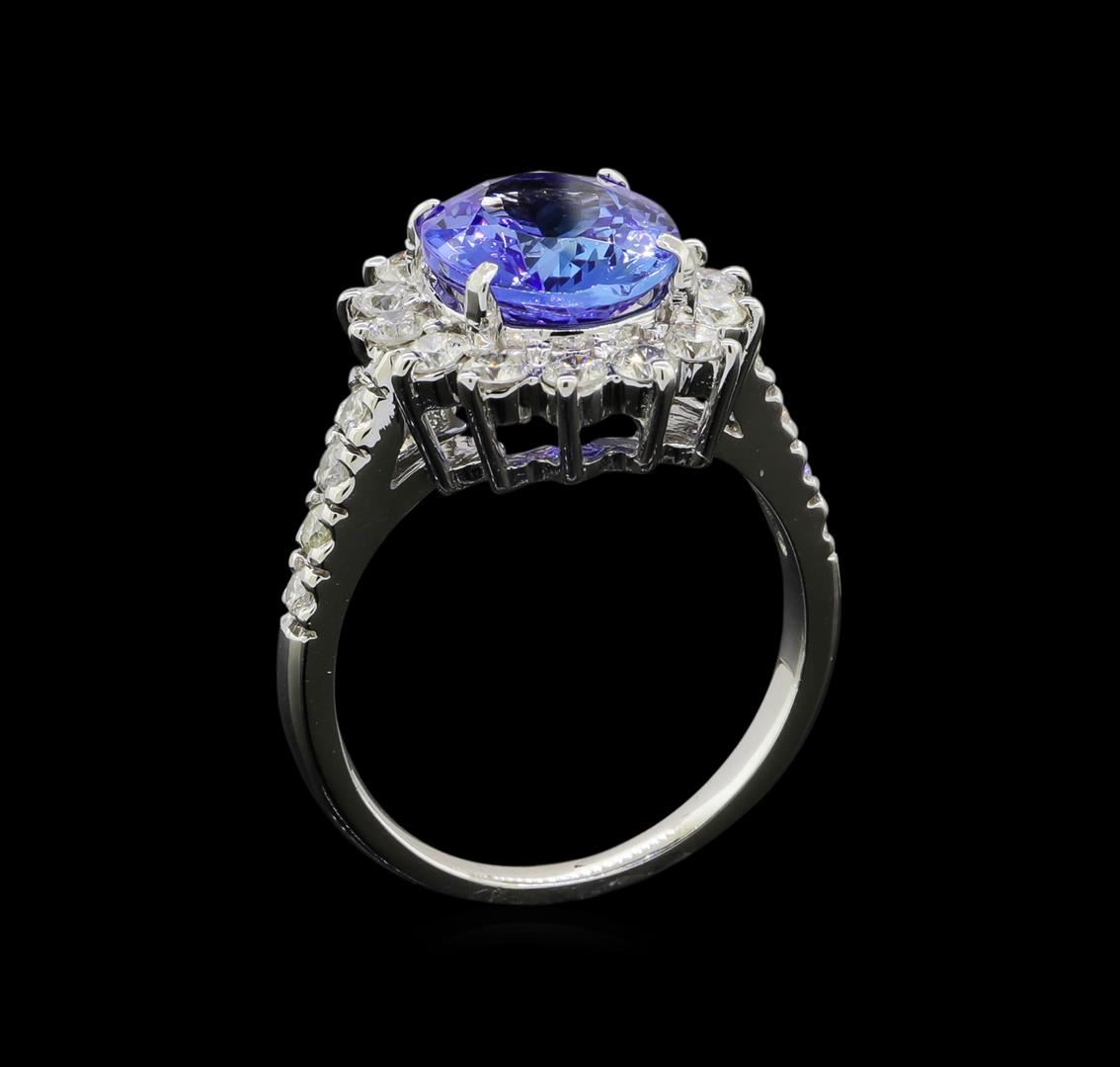 One electronically tested 14KT white gold lady's cast fashion ring with a basket halo with a bright polish finish. The featured lady's ring has a shank measuring 1.90 millimeters wide. Identified with markings of 'K14'. Condition is new, good workmanship. Containing: One prong set oval modified brilliant cut natural tanzanite, measuring 10.55 x 8.86 x 5.23mm, (depth est.) approximate weight of 3.37ct., clarity is eye clean, medium light, very slightly grayish, bluish violet color, (GIA bV 4/3), cut is very good. Transmitting light with no distortion, transparent. Colored gemstones are presumed to have been subjected to commonly used enhancement processes. Graded in the setting. Fourteen prong set round brilliant cut diamonds, measuring 2.35 - 2.25 x 1.43mm (depth est.) approximate total weight of 14 Stones = 0.65ct. Graded in the setting. Clarity SI-1 to I-1. Color: H - I Cut Good Eight prong set round brilliant cut diamonds, measuring 1.90 - 1.85 x 1.17mm (depth est.) approximate total weight of 8 Stones = 0.20ct. Graded in the setting. Clarity SI-1 to SI-2. Color: H - I Cut Good. Total Weight of Colored Stones 3.37ct.. Total Weight of Diamonds 0.85ct.. Total Weight of Ring 5.70gm. GAS Appraised at $6,345.00.