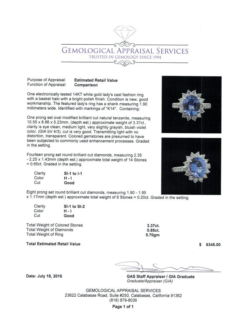 One electronically tested 14KT white gold lady's cast fashion ring with a basket halo with a bright polish finish. The featured lady's ring has a shank measuring 1.90 millimeters wide. Identified with markings of 'K14'. Condition is new, good workmanship. Containing: One prong set oval modified brilliant cut natural tanzanite, measuring 10.55 x 8.86 x 5.23mm, (depth est.) approximate weight of 3.37ct., clarity is eye clean, medium light, very slightly grayish, bluish violet color, (GIA bV 4/3), cut is very good. Transmitting light with no distortion, transparent. Colored gemstones are presumed to have been subjected to commonly used enhancement processes. Graded in the setting. Fourteen prong set round brilliant cut diamonds, measuring 2.35 - 2.25 x 1.43mm (depth est.) approximate total weight of 14 Stones = 0.65ct. Graded in the setting. Clarity SI-1 to I-1. Color: H - I Cut Good Eight prong set round brilliant cut diamonds, measuring 1.90 - 1.85 x 1.17mm (depth est.) approximate total weight of 8 Stones = 0.20ct. Graded in the setting. Clarity SI-1 to SI-2. Color: H - I Cut Good. Total Weight of Colored Stones 3.37ct.. Total Weight of Diamonds 0.85ct.. Total Weight of Ring 5.70gm. GAS Appraised at $6,345.00.