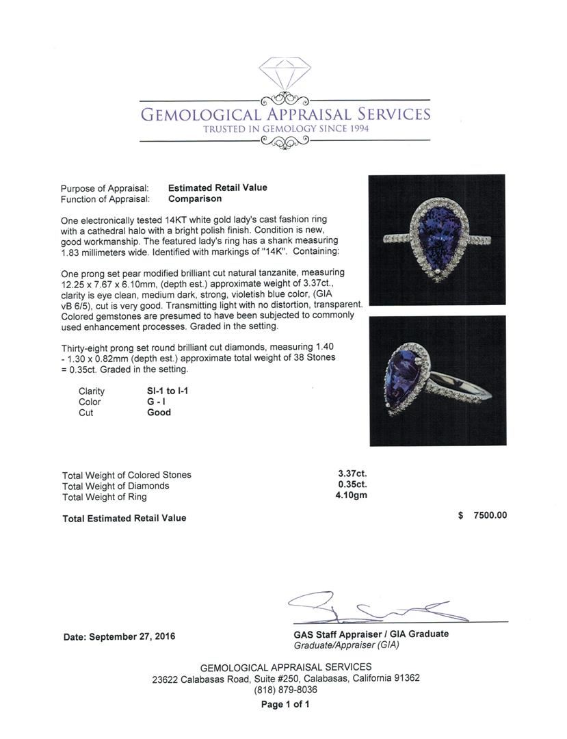 One electronically tested 14KT white gold lady's cast fashion ring with a cathedral halo with a bright polish finish. The featured lady's ring has a shank measuring 1.83 millimeters wide. Identified with markings of '14K'. Condition is new, good workmanship. Containing: One prong set pear modified brilliant cut natural tanzanite, measuring 12.25 x 7.67 x 6.10mm, (depth est.) approximate weight of 3.37ct., clarity is eye clean, medium dark, strong, violetish blue color, (GIA vB 6/5), cut is very good. Transmitting light with no distortion, transparent. Colored gemstones are presumed to have been subjected to commonly used enhancement processes. Graded in the setting. Thirty-Eight prong set round brilliant cut diamonds, measuring 1.40 - 1.30 x 0.82mm (depth est.) approximate total weight of 38 Stones = 0.35ct. Graded in the setting. Clarity SI-1 to I-1. Color: G - I Cut Good. Total Weight of Colored Stones 3.37ct.. Total Weight of Diamonds 0.35ct.. Total Weight of Ring 4.10gm. GAS Appraised at $7,500.00.