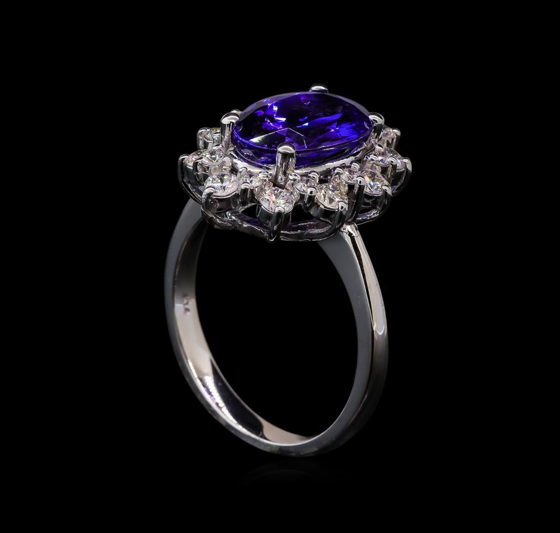 One electronically tested 14KT white gold lady's cast fashion ring with a scalloped basket halo with a bright polish finish. The featured lady's ring has a shank measuring 2.47 millimeters wide. Identified with markings of 'K14'. Condition is new, good workmanship. Containing: One prong set oval modified brilliant cut natural tanzanite, measuring 11.59 x 7.85 x 5.35mm, (depth est.) approximate weight of 3.37ct., clarity is eye clean, medium dark, strong, violetish blue color, (GIA vB 6/5), cut is very good. Transmitting light with no distortion, transparent. Colored gemstones are presumed to have been subjected to commonly used enhancement processes. Graded in the setting. Ten prong set round brilliant cut diamonds, measuring 2.50 - 2.40 x 1.47mm (depth est.) approximate total weight of 10 Stones = 0.54ct. Graded in the setting. Clarity SI-1 to SI-2. Color: H - I Cut Good Ten prong set round brilliant cut diamonds, measuring 1.80 - 1.70 x 1.09mm (depth est.) approximate total weight of 10 Stones = 0.21ct. Graded in the setting. Clarity SI-1 to SI-2. Color: H - I Cut Good. Total Weight of Colored Stones 3.37ct. Total Weight of Diamonds 0.75ct. Total Weight of Ring 5.50gm. GAS Appraised at $8,390.00.