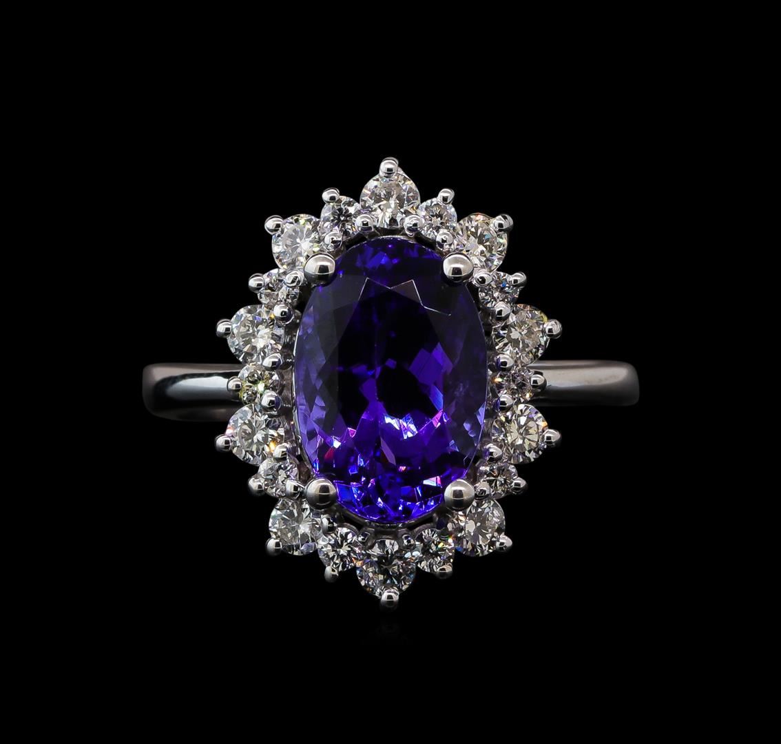 One electronically tested 14KT white gold lady's cast fashion ring with a scalloped basket halo with a bright polish finish. The featured lady's ring has a shank measuring 2.47 millimeters wide. Identified with markings of 'K14'. Condition is new, good workmanship. Containing: One prong set oval modified brilliant cut natural tanzanite, measuring 11.59 x 7.85 x 5.35mm, (depth est.) approximate weight of 3.37ct., clarity is eye clean, medium dark, strong, violetish blue color, (GIA vB 6/5), cut is very good. Transmitting light with no distortion, transparent. Colored gemstones are presumed to have been subjected to commonly used enhancement processes. Graded in the setting. Ten prong set round brilliant cut diamonds, measuring 2.50 - 2.40 x 1.47mm (depth est.) approximate total weight of 10 Stones = 0.54ct. Graded in the setting. Clarity SI-1 to SI-2. Color: H - I Cut Good Ten prong set round brilliant cut diamonds, measuring 1.80 - 1.70 x 1.09mm (depth est.) approximate total weight of 10 Stones = 0.21ct. Graded in the setting. Clarity SI-1 to SI-2. Color: H - I Cut Good. Total Weight of Colored Stones 3.37ct. Total Weight of Diamonds 0.75ct. Total Weight of Ring 5.50gm. GAS Appraised at $8,390.00.