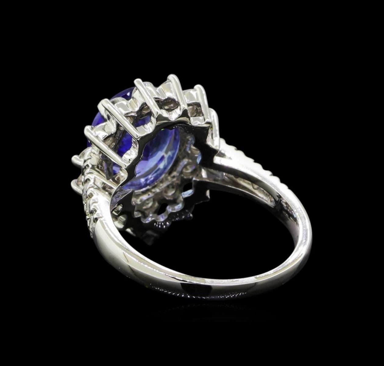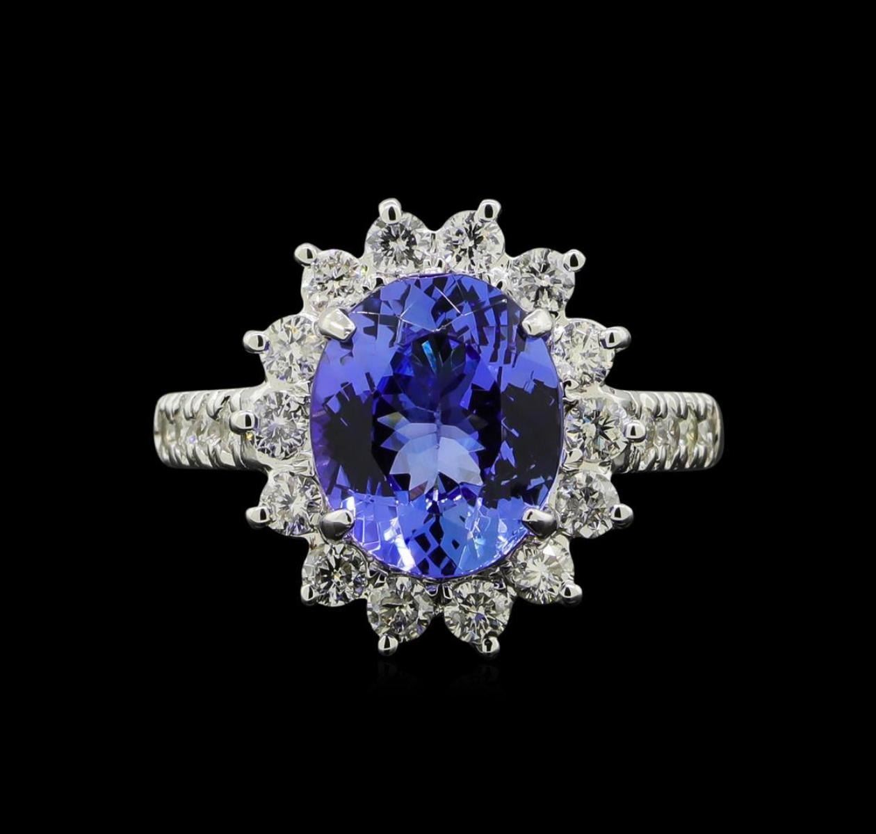 One electronically tested 14KT white gold lady's cast fashion ring with a basket halo with a bright polish finish. The featured lady's ring has a shank measuring 1.90 millimeters wide. Identified with markings of 'K14'. Condition is new, good workmanship. Containing: One prong set oval modified brilliant cut natural tanzanite, measuring 10.55 x 8.86 x 5.23mm, (depth est.) approximate weight of 3.37ct., clarity is eye clean, medium light, very slightly grayish, bluish violet color, (GIA bV 4/3), cut is very good. Transmitting light with no distortion, transparent. Colored gemstones are presumed to have been subjected to commonly used enhancement processes. Graded in the setting. Fourteen prong set round brilliant cut diamonds, measuring 2.35 - 2.25 x 1.43mm (depth est.) approximate total weight of 14 Stones = 0.65ct. Graded in the setting. Clarity SI-1 to I-1. Color: H - I Cut Good Eight prong set round brilliant cut diamonds, measuring 1.90 - 1.85 x 1.17mm (depth est.) approximate total weight of 8 Stones = 0.20ct. Graded in the setting. Clarity SI-1 to SI-2. Color: H - I Cut Good. Total Weight of Colored Stones 3.37ct.. Total Weight of Diamonds 0.85ct.. Total Weight of Ring 5.70gm.