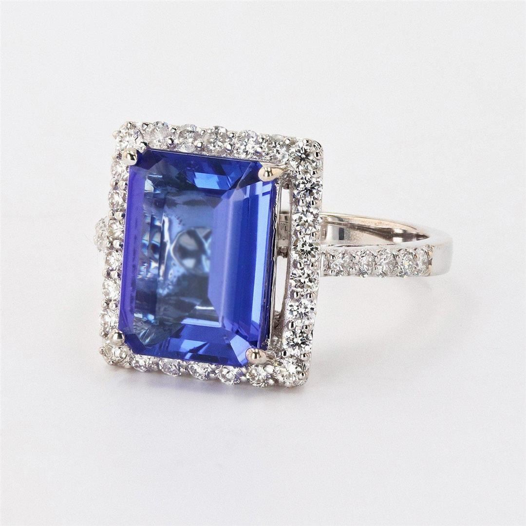 3.38ct Tanzanite and 0.67ctw Diamond 18K White Gold Ring. ONE 18K STAMPED WHITE GOLD LADY'S CUSTOM MADE DIAMOND & TANZANITE RING. 5.00 GR TW. CONTAINING: 1 - MAIN CENTER GEMSTONE(S) : IDENTITY : ONE CENTER NATURAL TANZANITE SET IN PRONGS SETTING STYLE. CARAT WEIGHT : 3.38 CT. SHAPE & MEASUREMEMT : EMERALD CUT. APPROX : 11.6 X 8.6 MM. QUALITY : FINE BLUE/PURPLISH COLOR , FINE CUT & CLARITY. 2 â€" ADJACENT GEMSTONES: IDENTITY : NATURAL DIAMONDS. SHAPE : ROUND BRILLIANT CUT. CARAT WEIGHT : 0.67 CTW. QUALITY : G/H COLOR , VS/SI CLARITY. ALL FINE CUTTING AND PROPORTIONS. ALL PRONGS SETTINGS STYLE. TOTAL GEMSTONES WEIGHT : 4.05 CTS TW.