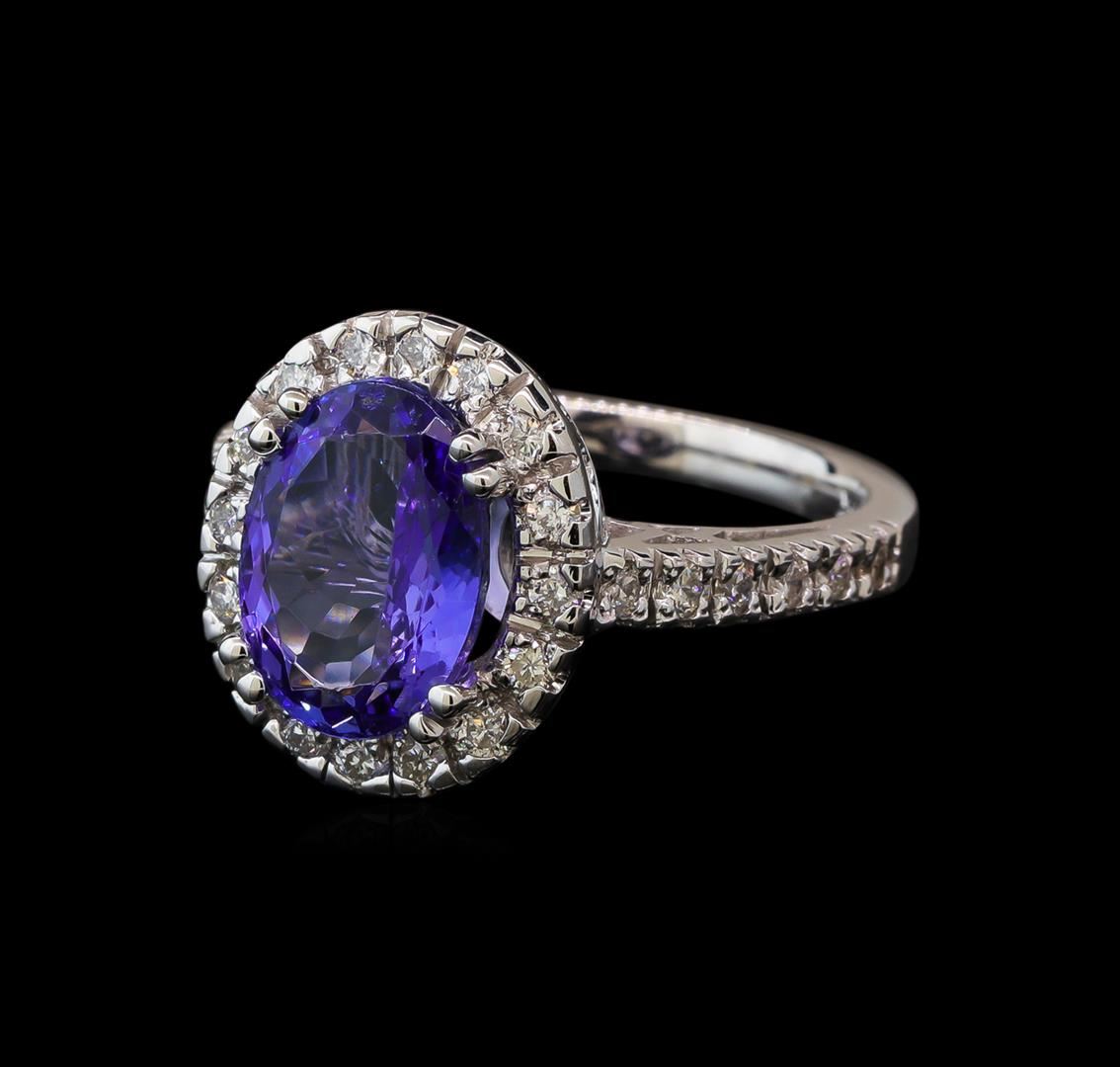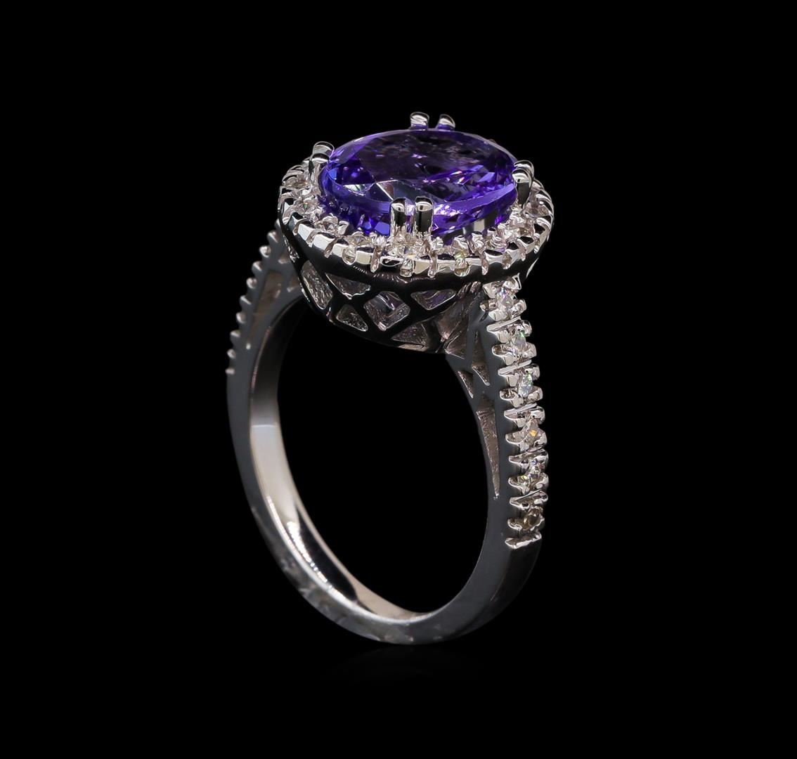 One electronically tested 14KT white gold lady's cast fashion ring with a basket halo with a bright polish finish. The featured lady's ring has a shank measuring 2.28 millimeters wide. Identified with markings of '14K'. Condition is new. Containing: One prong set oval modified brilliant cut natural tanzanite, measuring 11.13 x 8.34 x 4.71mm, (depth est.) 10%. bulge factor, approximate weight of 3.38ct., clarity is eye clean, medium light, moderately strong, violet color, (GIA V 4/4), cut is good. Transmitting light with no distortion, transparent. Colored gemstones are presumed to have been subjected to commonly used enhancement processes. Graded in the setting. Twenty-Eight prong set round brilliant cut diamonds, measuring 1.75 - 1.65 x 1.05mm (depth est.) approximate total weight of 28 Stones = 0.54ct. Graded in the setting. Clarity SI-1 to I-1. Color: H - I Cut Good. Total Weight of Colored Stones 3.38ct. Total Weight of Diamonds 0.54ct. Total Weight of Ring 6.50gm. GAS Appraised at $6,250.00.