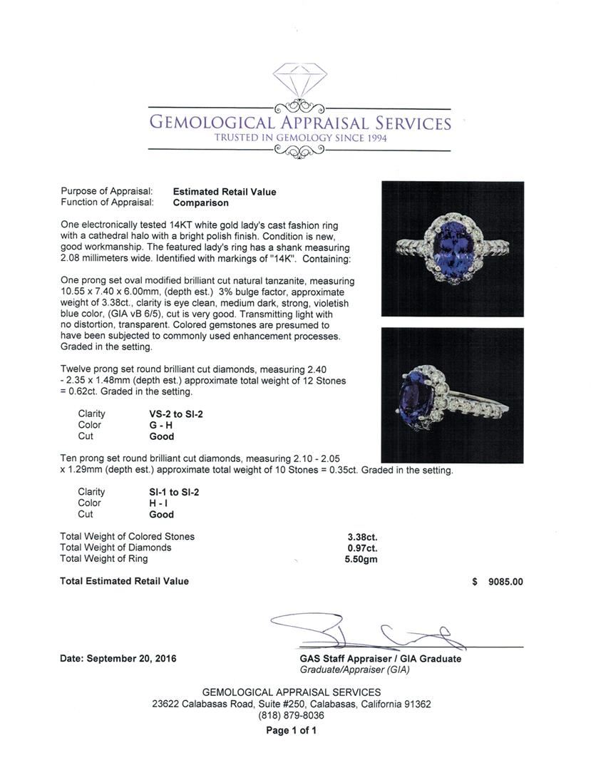 One electronically tested 14KT white gold lady's cast fashion ring with a cathedral halo with a bright polish finish. The featured lady's ring has a shank measuring 2.08 millimeters wide. Identified with markings of '14K'. Condition is new, good workmanship. Containing: One prong set oval modified brilliant cut natural tanzanite, measuring 10.55 x 7.40 x 6.00mm, (depth est.) 3%. bulge factor, approximate weight of 3.38ct., clarity is eye clean, medium dark, strong, violetish blue color, (GIA vB 6/5), cut is very good. Transmitting light with no distortion, transparent. Colored gemstones are presumed to have been subjected to commonly used enhancement processes. Graded in the setting. Twelve prong set round brilliant cut diamonds, measuring 2.40 - 2.35 x 1.48mm (depth est.) approximate total weight of 12 Stones = 0.62ct. Graded in the setting. Clarity VS-2 to SI-2. Color: G - H Cut Good Ten prong set round brilliant cut diamonds, measuring 2.10 - 2.05 x 1.29mm (depth est.) approximate total weight of 10 Stones = 0.35ct. Graded in the setting. Clarity SI-1 to SI-2. Color: H - I Cut Good. Total Weight of Colored Stones 3.38ct.. Total Weight of Diamonds 0.97ct.. Total Weight of Ring 5.50gm. GAS Appraised at $9,085.00.