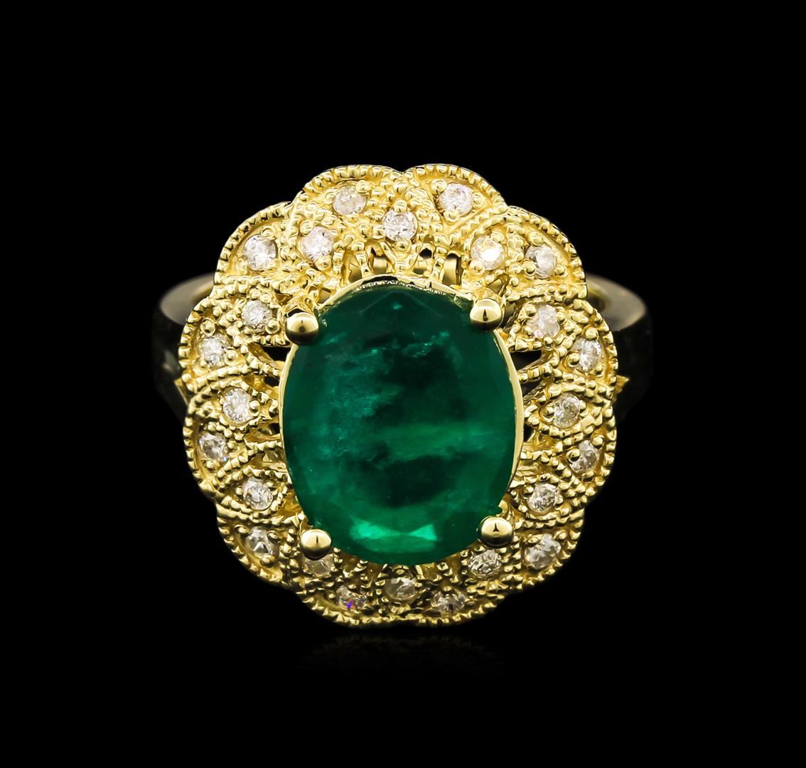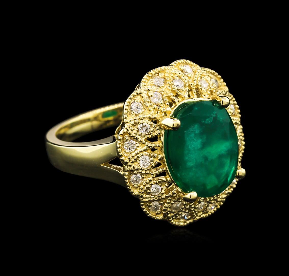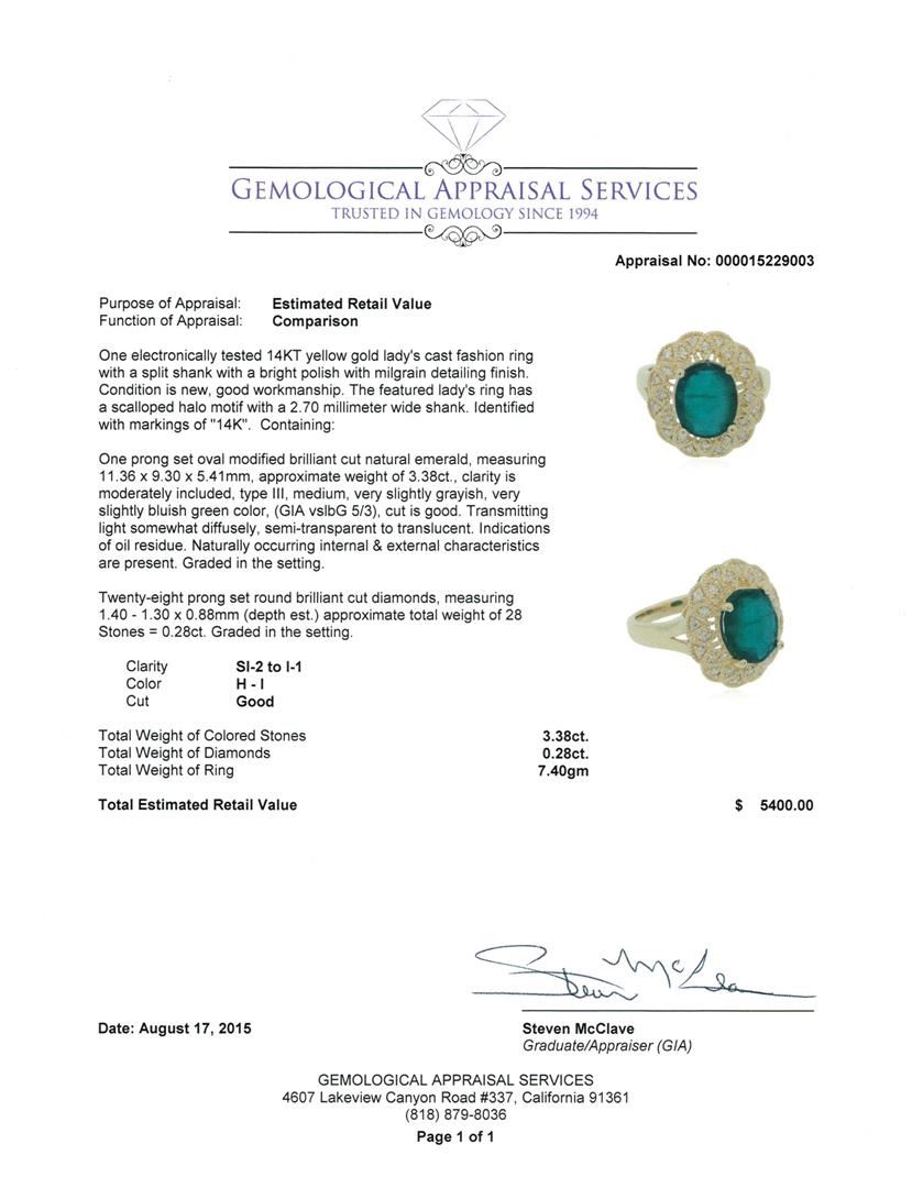 One electronically tested 14KT yellow gold lady's cast fashion ring with a split shank with a bright polish with milgrain detailing finish. The featured lady's ring has a scalloped halo motif with a 2.70 millimeter wide shank. Identified with markings of "14K". Condition is new, good workmanship. Containing: One prong set oval modified brilliant cut natural emerald, measuring 11.36 x 9.30 x 5.41mm, approximate weight of 3.38ct., clarity is moderately included, type III, medium, very slightly grayish, very slightly bluish green color, (GIA vslbG 5/3), cut is good. Transmitting light somewhat diffusely, semi-transparent to translucent. Indications of oil residue. Naturally occurring internal & external characteristics are present. Graded in the setting. Twenty-Eight prong set round brilliant cut diamonds, measuring 1.40 - 1.30 x 0.88mm (depth est.) approximate total weight of 28 Stones = 0.28ct. Graded in the setting. Clarity: SI-2 to I-1. Color: H - I. Cut Good. Total Weight of Colored Stones 3.38ct. Total Weight of Diamonds 0.28ct. Total Weight of Ring 7.40gm. GAS Appraised at $5,400.00.