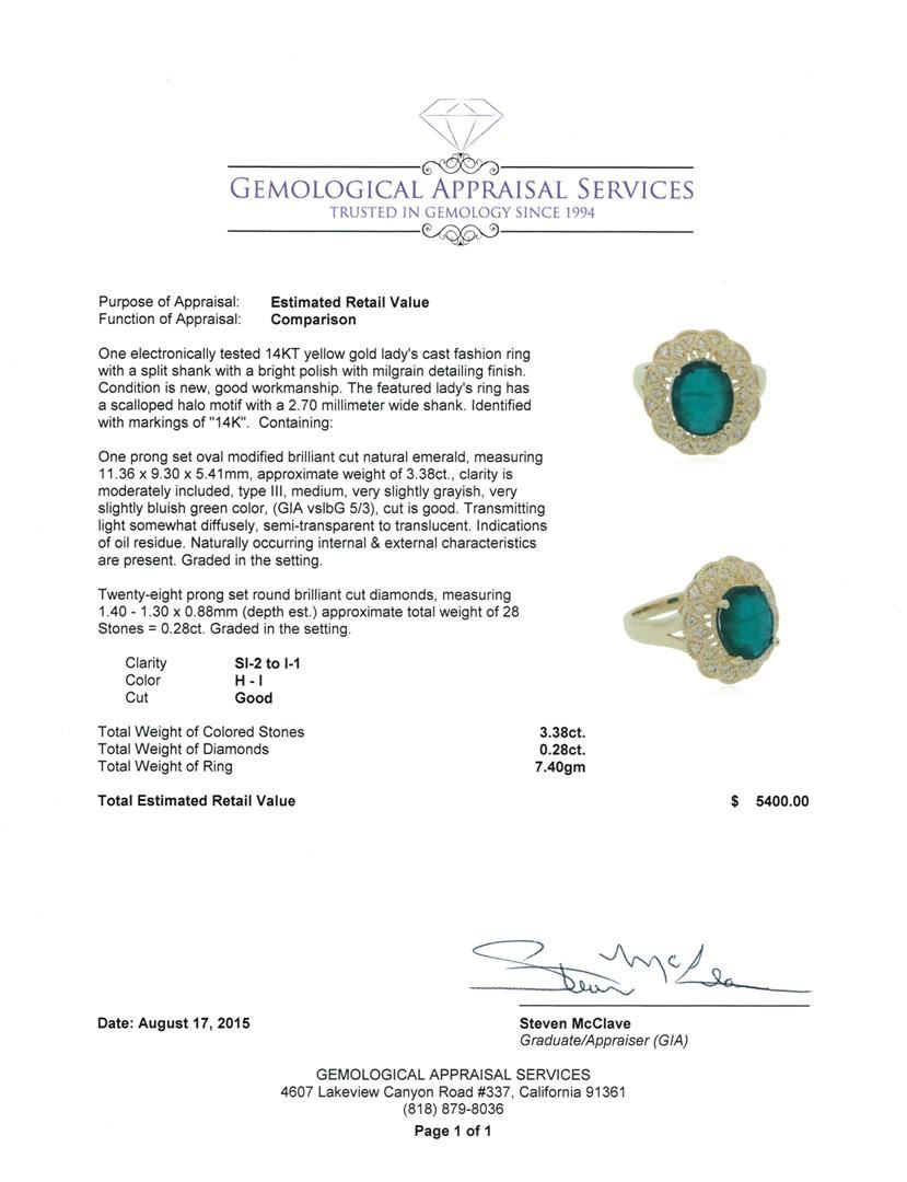 One electronically tested 14KT yellow gold lady's cast fashion ring with a split shank with a bright polish with milgrain detailing finish. The featured lady's ring has a scalloped halo motif with a 2.70 millimeter wide shank. Identified with markings of "14K". Condition is new, good workmanship. Containing: One prong set oval modified brilliant cut natural emerald, measuring 11.36 x 9.30 x 5.41mm, approximate weight of 3.38ct., clarity is moderately included, type III, medium, very slightly grayish, very slightly bluish green color, (GIA vslbG 5/3), cut is good. Transmitting light somewhat diffusely, semi-transparent to translucent. Indications of oil residue. Naturally occurring internal & external characteristics are present. Graded in the setting. Twenty-Eight prong set round brilliant cut diamonds, measuring 1.40 - 1.30 x 0.88mm (depth est.) approximate total weight of 28 Stones = 0.28ct. Graded in the setting. Clarity: SI-2 to I-1. Color: H - I. Cut Good. Total Weight of Colored Stones 3.38ct. Total Weight of Diamonds 0.28ct. Total Weight of Ring 7.40gm. GAS Appraised at $5,400.00.