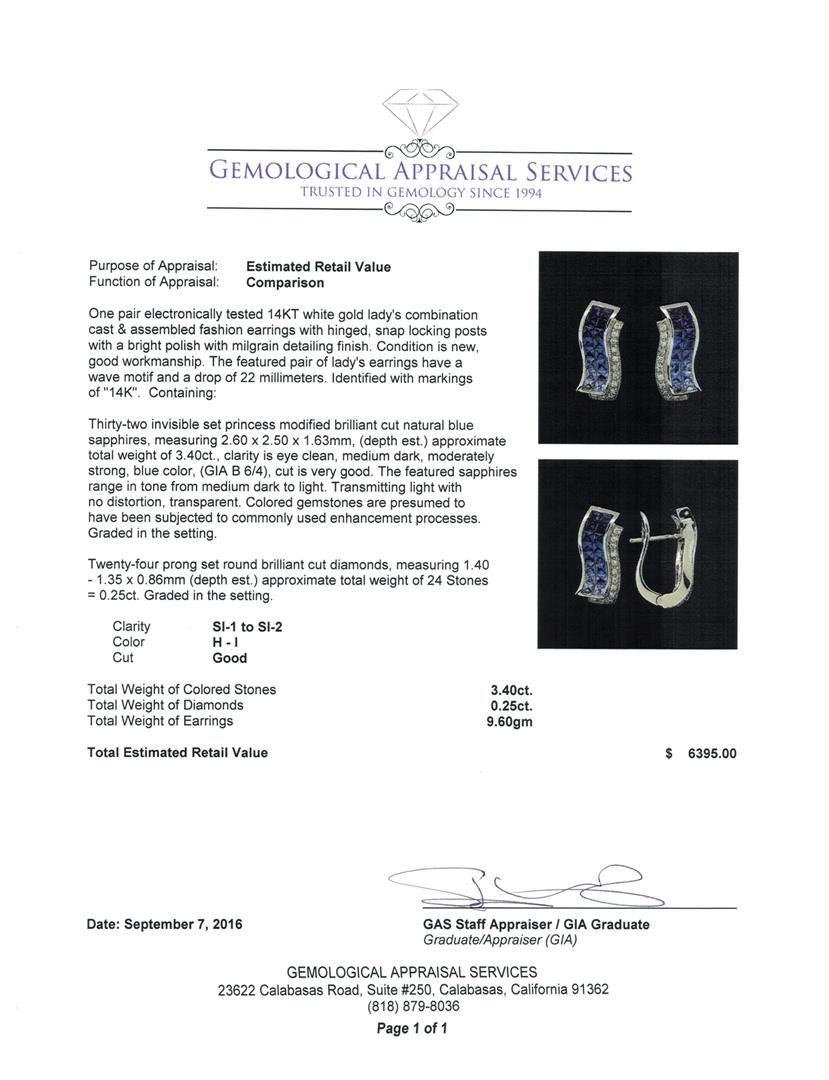 One pair electronically tested 14KT white gold lady's combination cast & assembled fashion earrings with hinged, snap locking posts with a bright polish with milgrain detailing finish. The featured pair of lady's earrings have a wave motif and a drop of 22 millimeters. Identified with markings of '14K'. Condition is new, good workmanship. Containing: Thirty-two invisible set princess modified brilliant cut natural blue sapphires, measuring 2.60 x 2.50 x 1.63mm, (depth est.) approximate total weight of 3.40ct., clarity is eye clean, medium dark, moderately strong, blue color, (GIA B 6/4), cut is very good. The featured sapphires range in tone from medium dark to light. Transmitting light with no distortion, transparent. Colored gemstones are presumed to have been subjected to commonly used enhancement processes. Graded in the setting. Twenty-Four prong set round brilliant cut diamonds, measuring 1.40 - 1.35 x 0.86mm (depth est.) approximate total weight of 24 Stones = 0.25ct. Graded in the setting. Clarity SI-1 to SI-2. Color: H - I Cut Good. Total Weight of Colored Stones 3.40ct.. Total Weight of Diamonds 0.25ct.. Total Weight of Earrings 9.60gm GAS Appraised at $6,395.00.