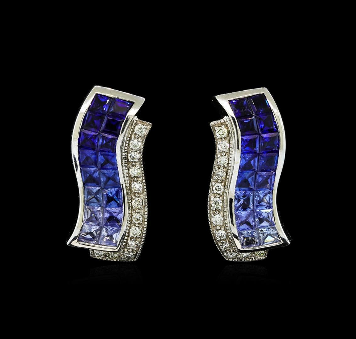 One pair electronically tested 14KT white gold lady's combination cast & assembled fashion earrings with hinged, snap locking posts with a bright polish with milgrain detailing finish. The featured pair of lady's earrings have a wave motif and a drop of 22 millimeters. Identified with markings of '14K'. Condition is new, good workmanship. Containing: Thirty-two invisible set princess modified brilliant cut natural blue sapphires, measuring 2.60 x 2.50 x 1.63mm, (depth est.) approximate total weight of 3.40ct., clarity is eye clean, medium dark, moderately strong, blue color, (GIA B 6/4), cut is very good. The featured sapphires range in tone from medium dark to light. Transmitting light with no distortion, transparent. Colored gemstones are presumed to have been subjected to commonly used enhancement processes. Graded in the setting. Twenty-Four prong set round brilliant cut diamonds, measuring 1.40 - 1.35 x 0.86mm (depth est.) approximate total weight of 24 Stones = 0.25ct. Graded in the setting. Clarity SI-1 to SI-2. Color: H - I Cut Good. Total Weight of Colored Stones 3.40ct.. Total Weight of Diamonds 0.25ct.. Total Weight of Earrings 9.60gm GAS Appraised at $6,395.00.