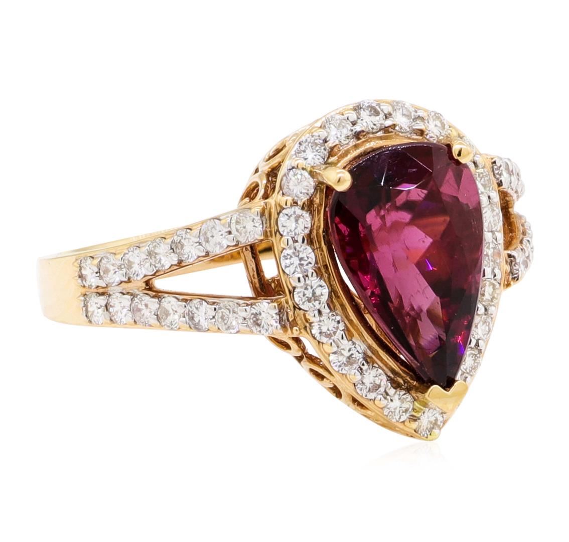 One electronically tested 18KT rose gold lady's cast fashion ring with a split shank halo with a bright polish finish. The featured lady's ring has a shank measuring 2.25 millimeters wide. Identified with markings of '18K'. Condition is new, good workmanship. Containing: One prong set pear modified brilliant cut natural rubellite, measuring 11.11 x 7.46 x 5.85mm, (depth est.) approximate weight of 2.76ct., clarity is eye clean, medium dark, strong, slightly purplish red color, (GIA slpR 6/5), cut is very good. Transmitting light with no distortion, transparent. Colored gemstones are presumed to have been subjected to commonly used enhancement processes. Graded in the setting. Fifty prong set round brilliant cut diamonds, measuring 1.60 - 1.50 x 0.93mm (depth est.) approximate total weight of 50 Stones = 0.64ct. Graded in the setting. Color G - I Clarity SI-1 to SI-2 Cut Good. Total Weight of Colored Stones 2.76ct.. Total Weight of Diamonds 0.64ct.. Total Weight of Ring 5.50gm GAS Appraised at $5925.00. GAS Appraised.