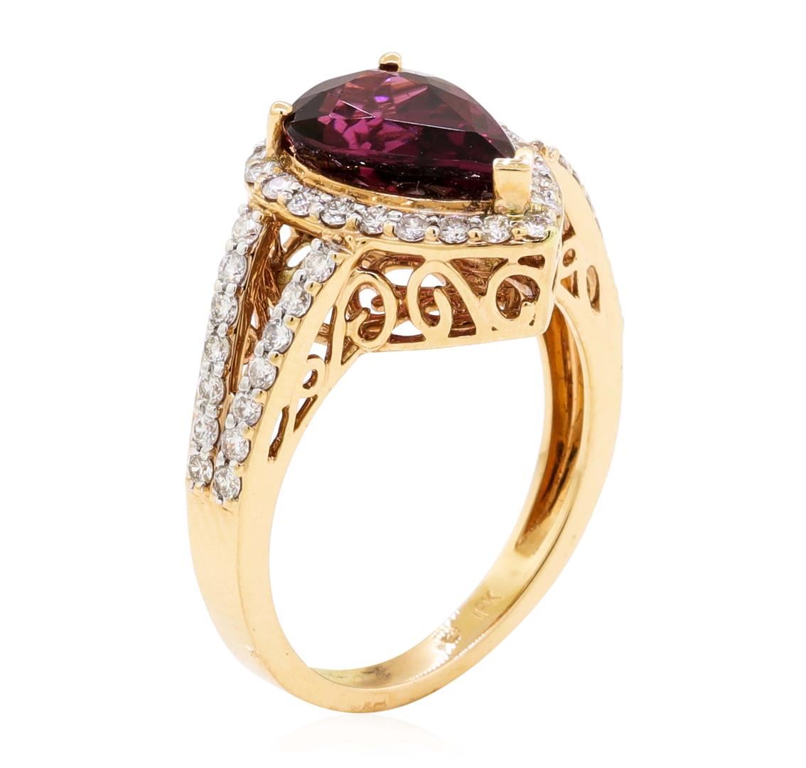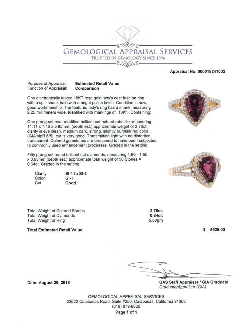 One electronically tested 18KT rose gold lady's cast fashion ring with a split shank halo with a bright polish finish. The featured lady's ring has a shank measuring 2.25 millimeters wide. Identified with markings of '18K'. Condition is new, good workmanship. Containing: One prong set pear modified brilliant cut natural rubellite, measuring 11.11 x 7.46 x 5.85mm, (depth est.) approximate weight of 2.76ct., clarity is eye clean, medium dark, strong, slightly purplish red color, (GIA slpR 6/5), cut is very good. Transmitting light with no distortion, transparent. Colored gemstones are presumed to have been subjected to commonly used enhancement processes. Graded in the setting. Fifty prong set round brilliant cut diamonds, measuring 1.60 - 1.50 x 0.93mm (depth est.) approximate total weight of 50 Stones = 0.64ct. Graded in the setting. Color G - I Clarity SI-1 to SI-2 Cut Good. Total Weight of Colored Stones 2.76ct.. Total Weight of Diamonds 0.64ct.. Total Weight of Ring 5.50gm GAS Appraised at $5925.00. GAS Appraised.