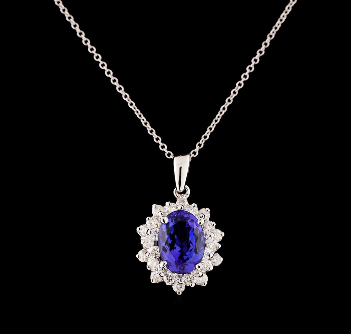One electronically tested 14KT white gold lady's combination cast & assembled fashion pendant & chain 18.0' long, 1.3mm round cable link with a lobster claw clasp with a bright polish finish. The featured lady's pendant and chain has a drop measuring 25 millimeters in length. Identified with markings of '14K'. Condition is new, good workmanship. Containing: One prong set oval modified brilliant cut natural tanzanite, measuring 10.74 x 7.80 x 5.32mm, (depth est.) 5%. bulge factor, approximate weight of 3.40ct., clarity is eye clean, medium, moderately strong, bluish violet color, (GIA bV 5/4), cut is very good. Transmitting light with no distortion, transparent. Colored gemstones are presumed to have been subjected to commonly used enhancement processes. Graded in the setting. Thirty prong set round brilliant cut diamonds, measuring 2.05 - 2.00 x 1.26mm (depth est.) approximate total weight of 30 Stones = 0.95ct. Graded in the setting. Clarity SI-1 to SI-2. Color: H - I Cut Good. Total Weight of Colored Stones 3.40ct.. Total Weight of Diamonds 0.95ct.. Total Weight of Pendant & Chain 5.90gm. GAS Appraised at $8,300.00.
