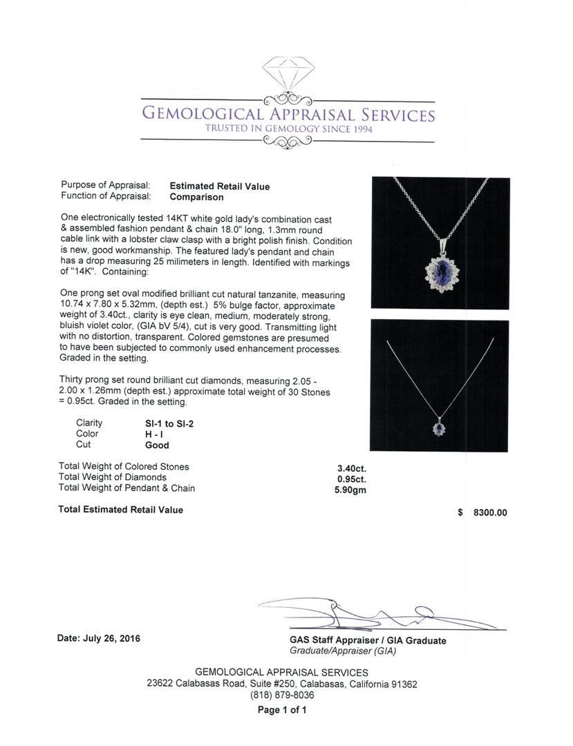 One electronically tested 14KT white gold lady's combination cast & assembled fashion pendant & chain 18.0' long, 1.3mm round cable link with a lobster claw clasp with a bright polish finish. The featured lady's pendant and chain has a drop measuring 25 millimeters in length. Identified with markings of '14K'. Condition is new, good workmanship. Containing: One prong set oval modified brilliant cut natural tanzanite, measuring 10.74 x 7.80 x 5.32mm, (depth est.) 5%. bulge factor, approximate weight of 3.40ct., clarity is eye clean, medium, moderately strong, bluish violet color, (GIA bV 5/4), cut is very good. Transmitting light with no distortion, transparent. Colored gemstones are presumed to have been subjected to commonly used enhancement processes. Graded in the setting. Thirty prong set round brilliant cut diamonds, measuring 2.05 - 2.00 x 1.26mm (depth est.) approximate total weight of 30 Stones = 0.95ct. Graded in the setting. Clarity SI-1 to SI-2. Color: H - I Cut Good. Total Weight of Colored Stones 3.40ct.. Total Weight of Diamonds 0.95ct.. Total Weight of Pendant & Chain 5.90gm. GAS Appraised at $8,300.00.