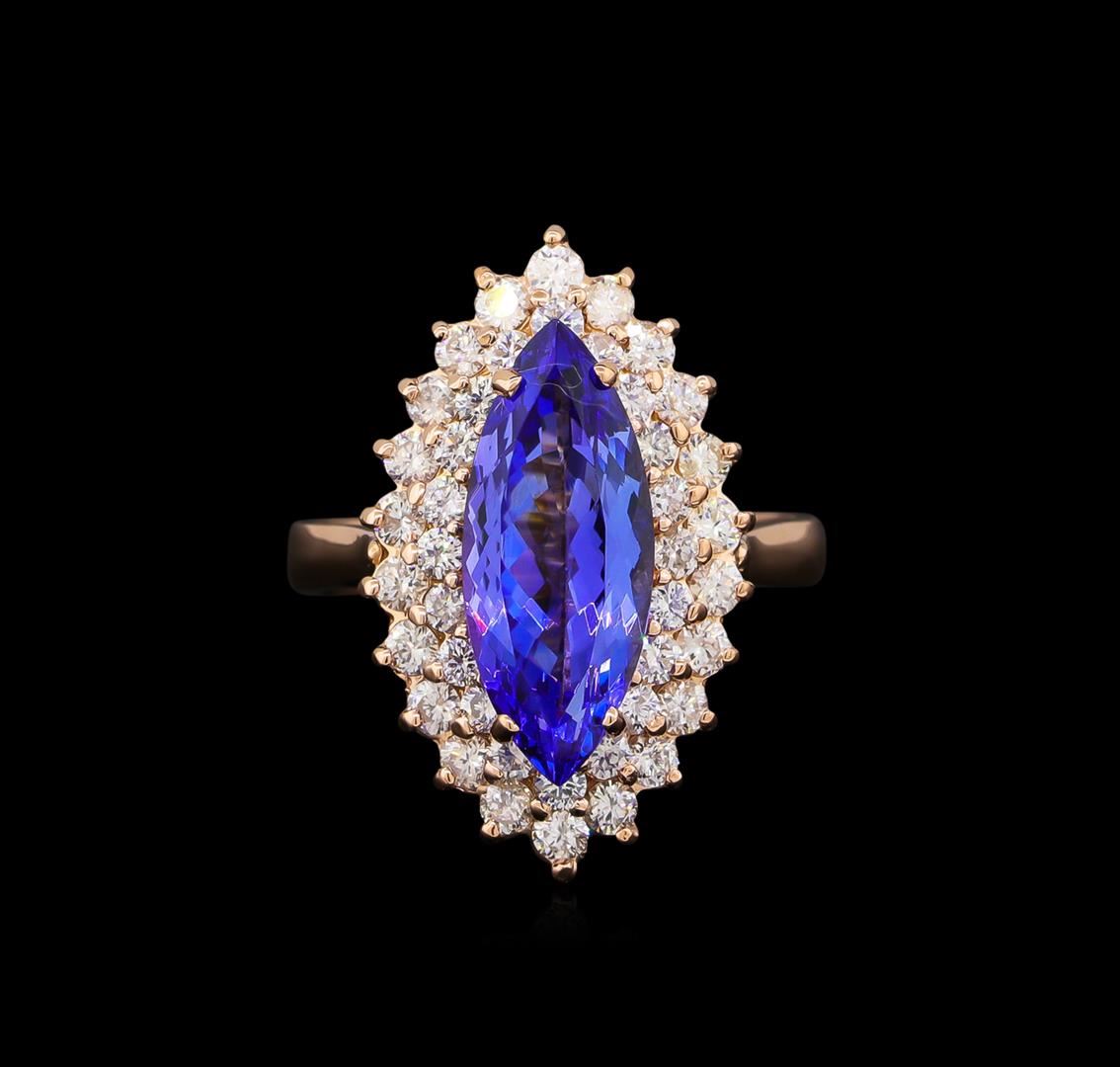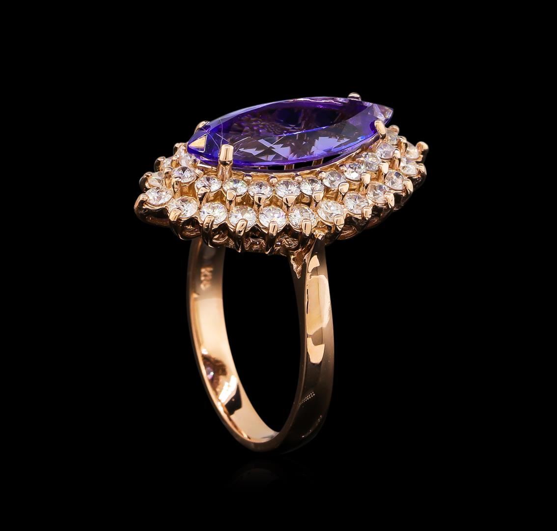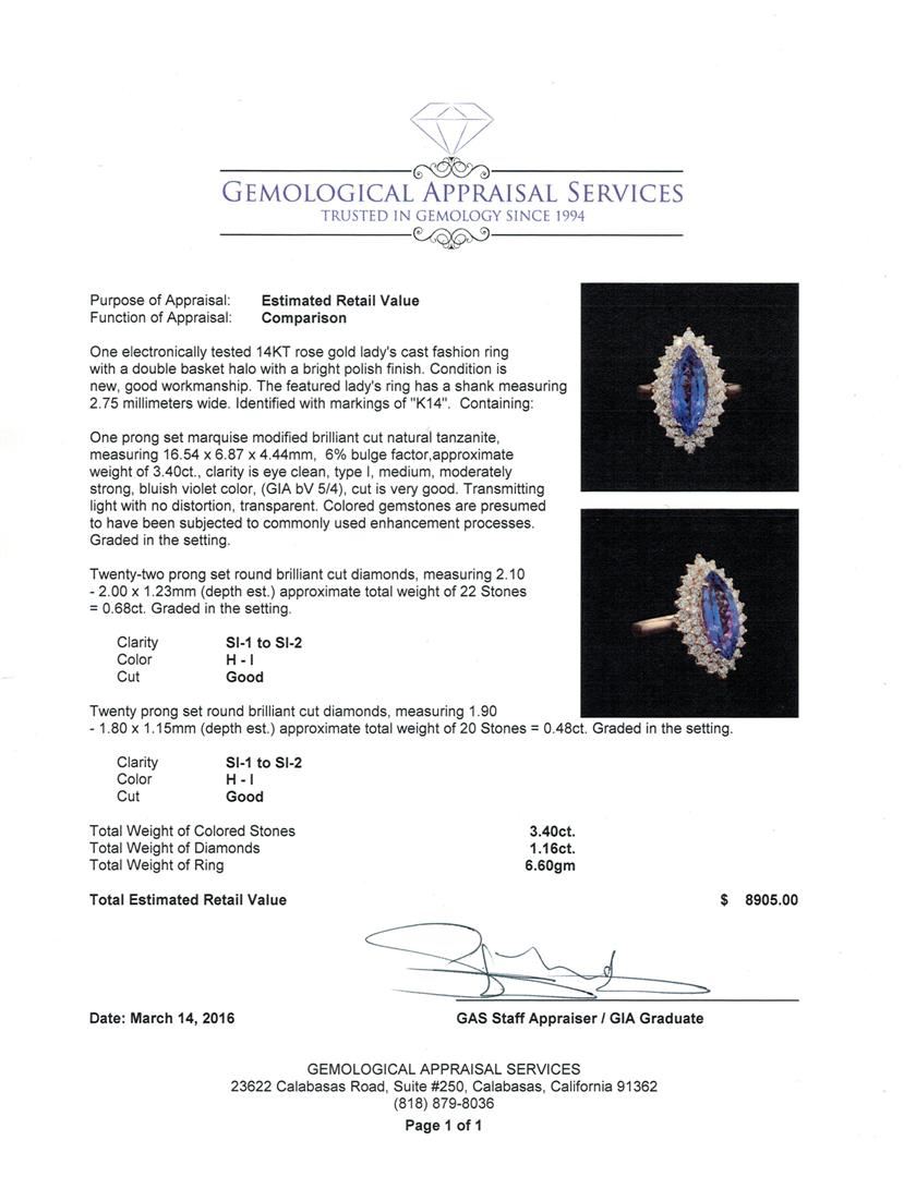 One electronically tested 14KT rose gold lady's cast fashion ring with a double basket halo with a bright polish finish. The featured lady's ring has a shank measuring 2.75 millimeters wide. Identified with markings of "K14". Condition is new, good workmanship. Containing: One prong set marquise modified brilliant cut natural tanzanite, measuring 16.54 x 6.87 x 4.44mm, 6%. bulge factor, approximate weight of 3.40ct., clarity is eye clean, type I, medium, moderately strong, bluish violet color, (GIA bV 5/4), cut is very good. Transmitting light with no distortion, transparent. Colored gemstones are presumed to have been subjected to commonly used enhancement processes. Graded in the setting. Twenty-Two prong set round brilliant cut diamonds, measuring 2.10 - 2.00 x 1.23mm (depth est.) approximate total weight of 22 Stones = 0.68ct. Graded in the setting. Clarity: SI-1 to SI-2. Color: H - I. Cut Good Twenty prong set round brilliant cut diamonds, measuring 1.90 - 1.80 x 1.15mm (depth est.) approximate total weight of 20 Stones = 0.48ct. Graded in the setting. Clarity: SI-1 to SI-2. Color: H - I. Cut Good. Total Weight of Colored Stones 3.40ct. Total Weight of Diamonds 1.16ct. Total Weight of Ring 6.60gm. GAS Appraised at $8,905.00.