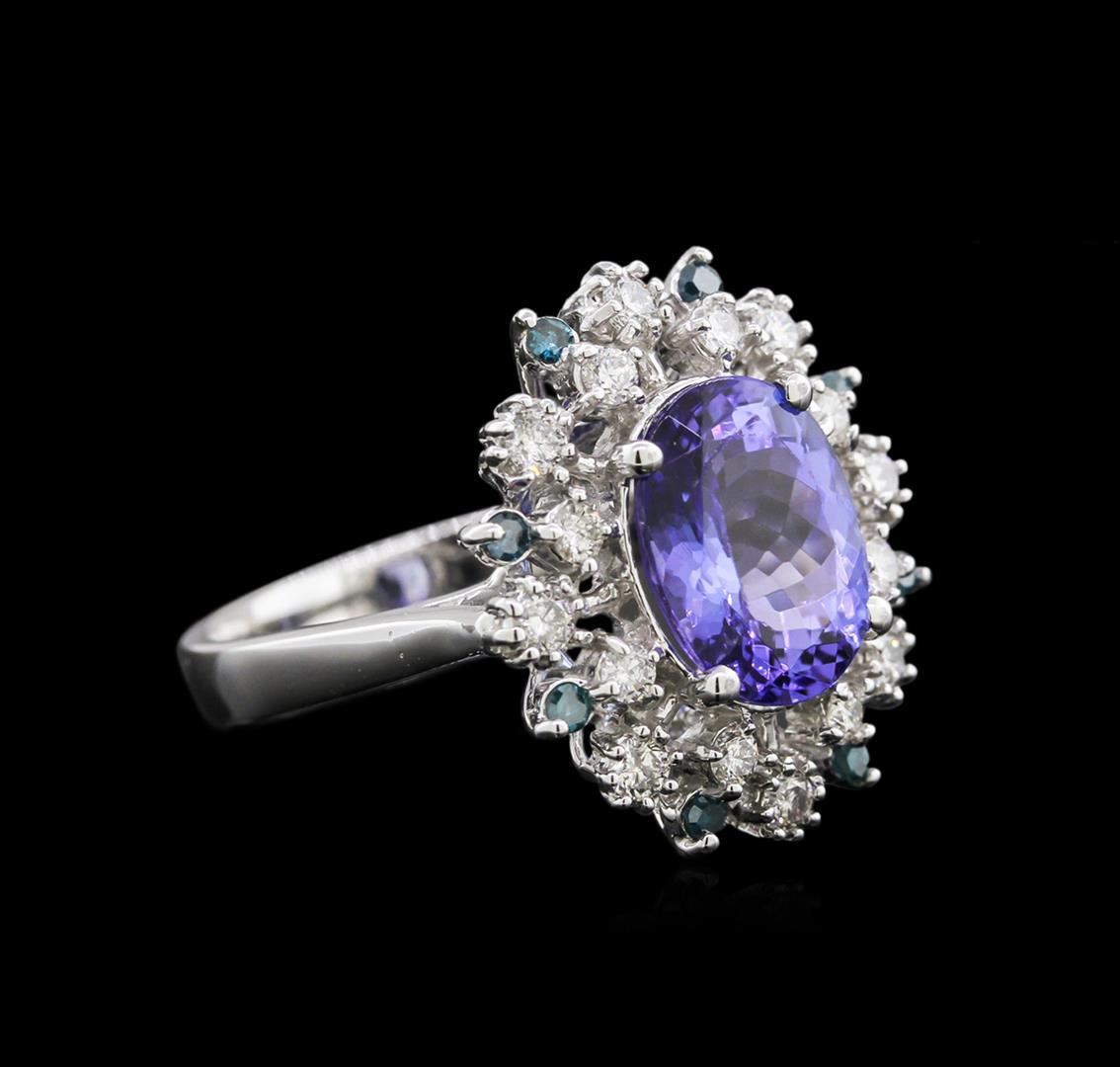 One electronically tested 14KT white gold lady's cast fashion ring with a basket setting with a bright polish finish. The featured ring has a 3.00mm shank Identified with markings of "K14". Condition is new, good workmanship. Containing: One prong set oval modified brilliant cut natural tanzanite, measuring 10.65 x 8.20 x 5.25mm, 5% bulge factor, approximate weight of 3.40ct., clarity is eye clean, type I, medium, very slightly grayish, bluish violet color, (GIA bV 5/3), cut is very good. Transmitting light with a minimum of distortion, transparent. Colored gemstones are presumed to have been subjected to commonly used enhancement processes. Graded in the setting. Sixteen prong set round brilliant cut diamonds, measuring 2.10 - 2.00 x 1.33mm (depth est.) approximate total weight of 16 Stones = 0.52ct. Graded in the setting. Clarity: SI-1 to I-1. Color: H - I. Cut Good Eight prong set round brilliant cut diamonds, measuring 1.70 - 1.65 x 1.09mm (depth est.) approximate total weight of 8 Stones = 0.15ct. Graded in the setting. Clarity: SI-2 to I-1 Cut Good. Total Weight of Colored Stones 3.40ct. Total Weight of Diamonds 0.67ct. Total Weight of Ring 6.00gm. GAS Appraised at $8,455.00.