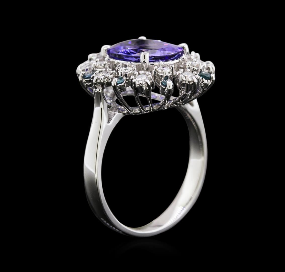 One electronically tested 14KT white gold lady's cast fashion ring with a basket setting with a bright polish finish. The featured ring has a 3.00mm shank Identified with markings of "K14". Condition is new, good workmanship. Containing: One prong set oval modified brilliant cut natural tanzanite, measuring 10.65 x 8.20 x 5.25mm, 5% bulge factor, approximate weight of 3.40ct., clarity is eye clean, type I, medium, very slightly grayish, bluish violet color, (GIA bV 5/3), cut is very good. Transmitting light with a minimum of distortion, transparent. Colored gemstones are presumed to have been subjected to commonly used enhancement processes. Graded in the setting. Sixteen prong set round brilliant cut diamonds, measuring 2.10 - 2.00 x 1.33mm (depth est.) approximate total weight of 16 Stones = 0.52ct. Graded in the setting. Clarity: SI-1 to I-1. Color: H - I. Cut Good Eight prong set round brilliant cut diamonds, measuring 1.70 - 1.65 x 1.09mm (depth est.) approximate total weight of 8 Stones = 0.15ct. Graded in the setting. Clarity: SI-2 to I-1 Cut Good. Total Weight of Colored Stones 3.40ct. Total Weight of Diamonds 0.67ct. Total Weight of Ring 6.00gm. GAS Appraised at $8,455.00.