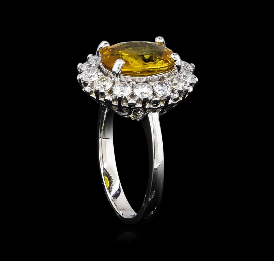 14K White Gold 0.70CT Sapphire 0.90CT Diamond Ring. Description: Metal: 14k solid white gold. Face Measurements: 15 x 17mm. Size: 7.25. Shank Width: 2.5mm. Finish: bright polish. Total Item Weight: 5.5 grams. Markings: stamped 14K. Country Made: USA. Main Stone: sapphire. Quantity: 1. Shape: oval. Color: yellow. Carat Total Weight: 3.40. Measurements: 8 x 11mm. Treatment: heating. Setting: prong. Hue: yellowish orange. Saturation: moderately strong. Tone: dark. Clarity: type 2. Cut: very good. Secondary Stone: diamond. Quantity: 14. Shape: round. Color: white. Carat Total Weight: 1.10. Measurements: 2.6mm. Treatment: none. Setting: prong. Color Grade: G-H. Clarity: SI1-SI2. Cut: very good. Excellent Workmanship. Gemstones graded in the mounting. BHGL Appraised at $13,980.00.