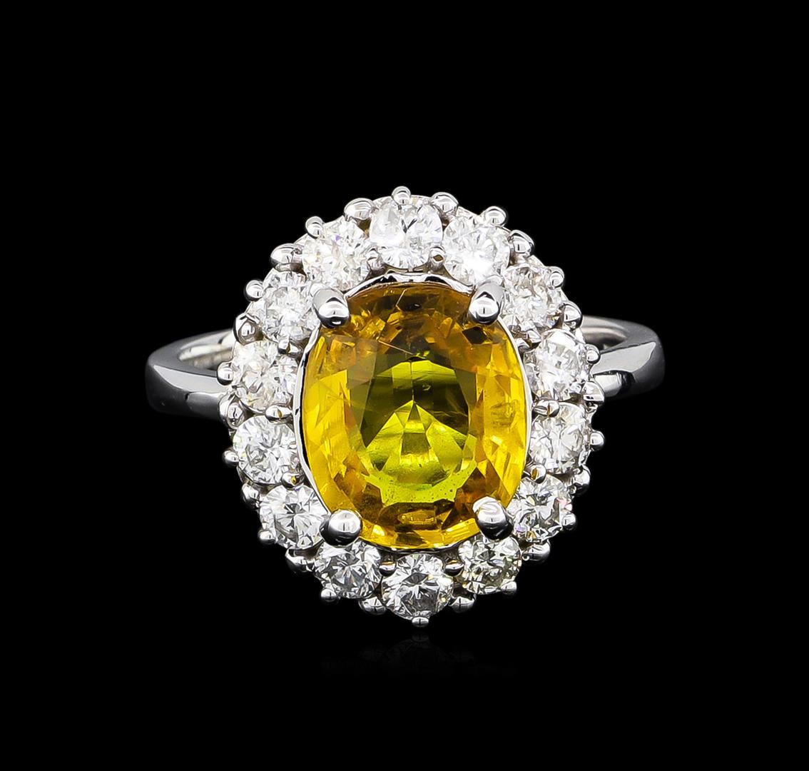 14K White Gold 0.70CT Sapphire 0.90CT Diamond Ring. Description: Metal: 14k solid white gold. Face Measurements: 15 x 17mm. Size: 7.25. Shank Width: 2.5mm. Finish: bright polish. Total Item Weight: 5.5 grams. Markings: stamped 14K. Country Made: USA. Main Stone: sapphire. Quantity: 1. Shape: oval. Color: yellow. Carat Total Weight: 3.40. Measurements: 8 x 11mm. Treatment: heating. Setting: prong. Hue: yellowish orange. Saturation: moderately strong. Tone: dark. Clarity: type 2. Cut: very good. Secondary Stone: diamond. Quantity: 14. Shape: round. Color: white. Carat Total Weight: 1.10. Measurements: 2.6mm. Treatment: none. Setting: prong. Color Grade: G-H. Clarity: SI1-SI2. Cut: very good. Excellent Workmanship. Gemstones graded in the mounting. BHGL Appraised at $13,980.00.