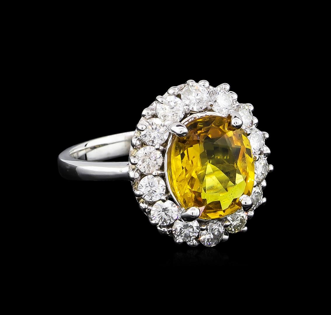 14K White Gold 0.70CT Sapphire 0.90CT Diamond Ring. Description: Metal: 14k solid white gold. Face Measurements: 15 x 17mm. Size: 7.25. Shank Width: 2.5mm. Finish: bright polish. Total Item Weight: 5.5 grams. Markings: stamped 14K. Country Made: USA. Main Stone: sapphire. Quantity: 1. Shape: oval. Color: yellow. Carat Total Weight: 3.40. Measurements: 8 x 11mm. Treatment: heating. Setting: prong. Hue: yellowish orange. Saturation: moderately strong. Tone: dark. Clarity: type 2. Cut: very good. Secondary Stone: diamond. Quantity: 14. Shape: round. Color: white. Carat Total Weight: 1.10. Measurements: 2.6mm. Treatment: none. Setting: prong. Color Grade: G-H. Clarity: SI1-SI2. Cut: very good. Excellent Workmanship. Gemstones graded in the mounting. BHGL Appraised at $13,980.00.