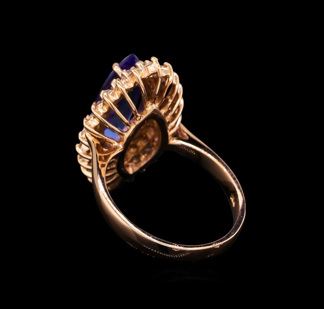 One electronically tested 14KT rose gold lady's cast fashion ring with a double basket halo with a bright polish finish. The featured lady's ring has a shank measuring 2.75 millimeters wide. Identified with markings of "K14". Condition is new, good workmanship. Containing: One prong set marquise modified brilliant cut natural tanzanite, measuring 16.54 x 6.87 x 4.44mm, 6%. bulge factor, approximate weight of 3.40ct., clarity is eye clean, type I, medium, moderately strong, bluish violet color, (GIA bV 5/4), cut is very good. Transmitting light with no distortion, transparent. Colored gemstones are presumed to have been subjected to commonly used enhancement processes. Graded in the setting. Twenty-Two prong set round brilliant cut diamonds, measuring 2.10 - 2.00 x 1.23mm (depth est.) approximate total weight of 22 Stones = 0.68ct. Graded in the setting. Clarity: SI-1 to SI-2. Color: H - I. Cut Good Twenty prong set round brilliant cut diamonds, measuring 1.90 - 1.80 x 1.15mm (depth est.) approximate total weight of 20 Stones = 0.48ct. Graded in the setting. Clarity: SI-1 to SI-2. Color: H - I. Cut Good. Total Weight of Colored Stones 3.40ct. Total Weight of Diamonds 1.16ct. Total Weight of Ring 6.60gm. GAS Appraised at $8,905.00.