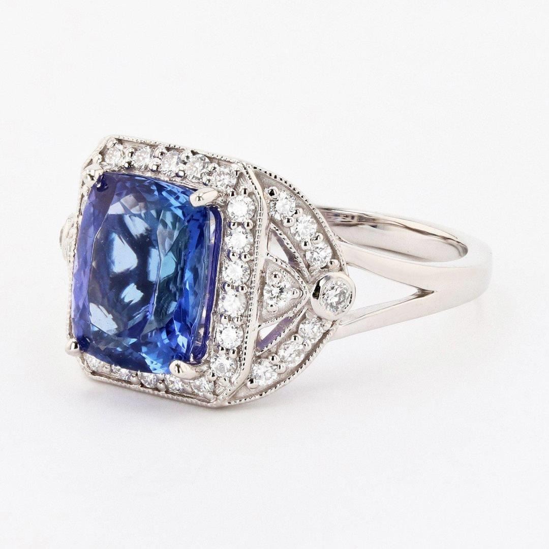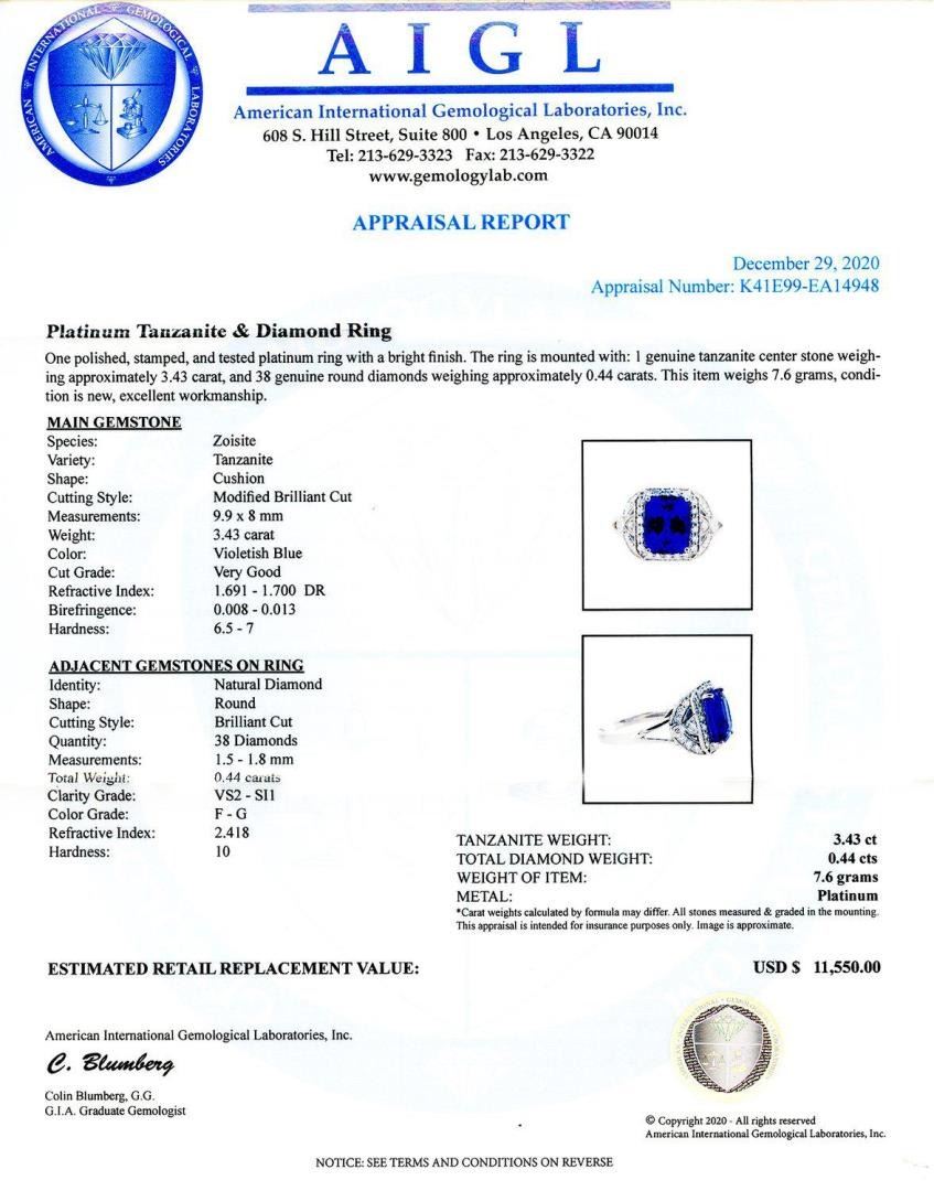 Platinum Tanzanite & Diamond Ring One polished, stamped, and tested platinum ring with a bright finish. The ring is mounted with: 1 genuine tanzanite center stone weigh-ing approximately 3.43 carat, and 38 genuine round diamonds weighing approximately 0.44 carats. This item weighs 7.6 grams, condi-tion is new, excellent workmanship. MAIN GEMSTONE Species: Zoisite Variety: Tanzanite Shape: Cushion Cutting Style: Modified Brilliant Cut Measurements: 9.9 x 8mm Weight: 3.43 carat Color: Violetish Blue Cut Grade: Very Good Refractive Index: 1.691 - 1.700 DR Birefringence: 0.008 - 0.013 Hardness: 6.5 - 7 ADJACENT GEMSTONES ON RING Identity: Natural Diamond Shape: Round Cutting Style: Brilliant Cut Quantity: 38 Diamonds Measurements: 1.5 - 1.8 mm Total Weight: 0.44 carats Clarity Grade: VS2 to SI1 Color Grade: F - G Refractive Index: 2.418 Hardness: 10 TANZANITE WEIGHT: 3.43ct TOTAL DIAMOND WEIGHT: 0.44ctw WEIGHT OF ITEM: 7.6 grams METAL: Platinum