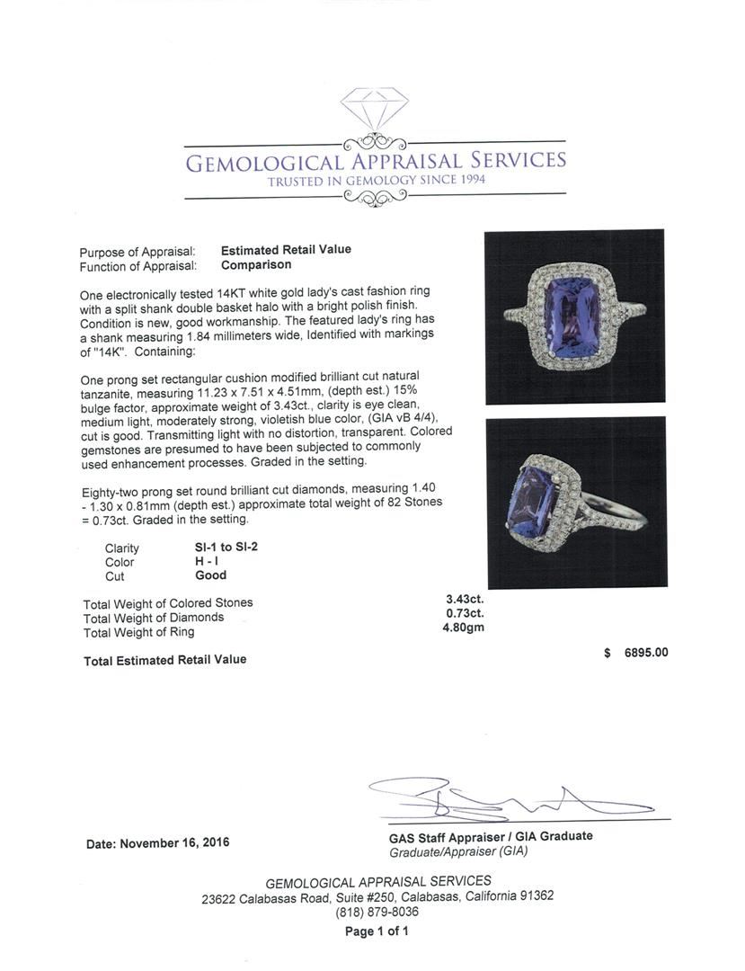 One electronically tested 14KT white gold lady's cast fashion ring with a split shank double basket halo with a bright polish finish. The featured lady's ring has a shank measuring 1.84 millimeters wide, Identified with markings of '14K'. Condition is new, good workmanship. Containing: One prong set rectangular cushion modified brilliant cut natural tanzanite, measuring 11.23 x 7.51 x 4.51mm, (depth est.) 15%. bulge factor, approximate weight of 3.43ct., clarity is eye clean, medium light, moderately strong, violetish blue color, (GIA vB 4/4), cut is good. Transmitting light with no distortion, transparent. Colored gemstones are presumed to have been subjected to commonly used enhancement processes. Graded in the setting. Eighty-Two prong set round brilliant cut diamonds, measuring 1.40 - 1.30 x 0.81mm (depth est.) approximate total weight of 82 Stones = 0.73ct. Graded in the setting. Clarity SI-1 to SI-2. Color: H - I Cut Good. Total Weight of Colored Stones 3.43ct.. Total Weight of Diamonds 0.73ct.. Total Weight of Ring 4.80gm. GAS Appraised at $6,895.00.