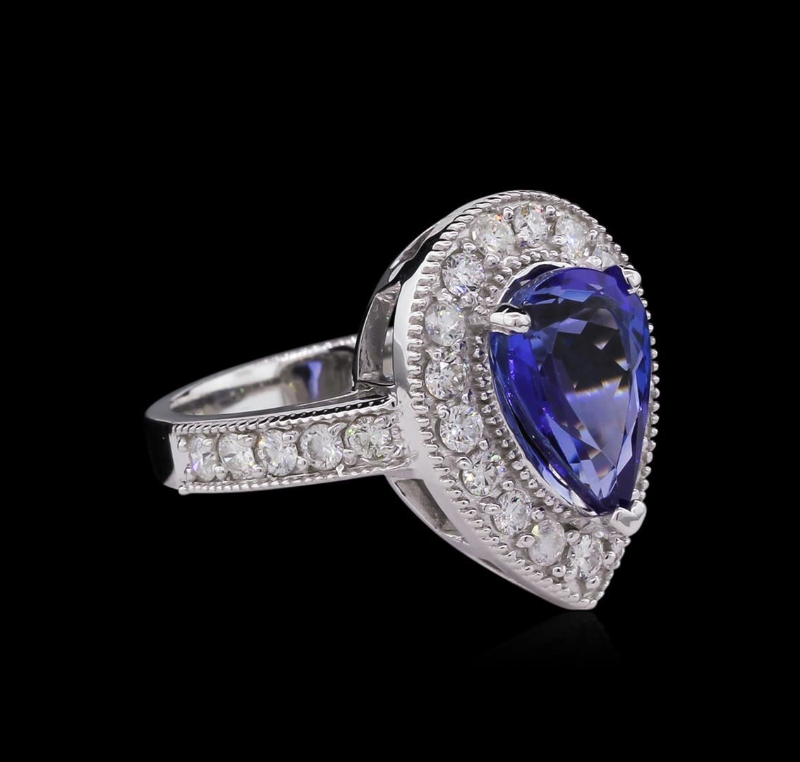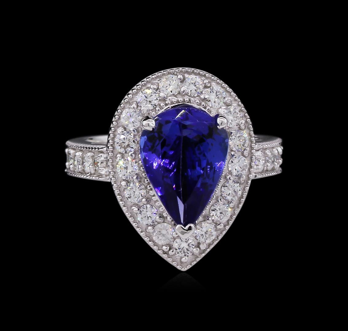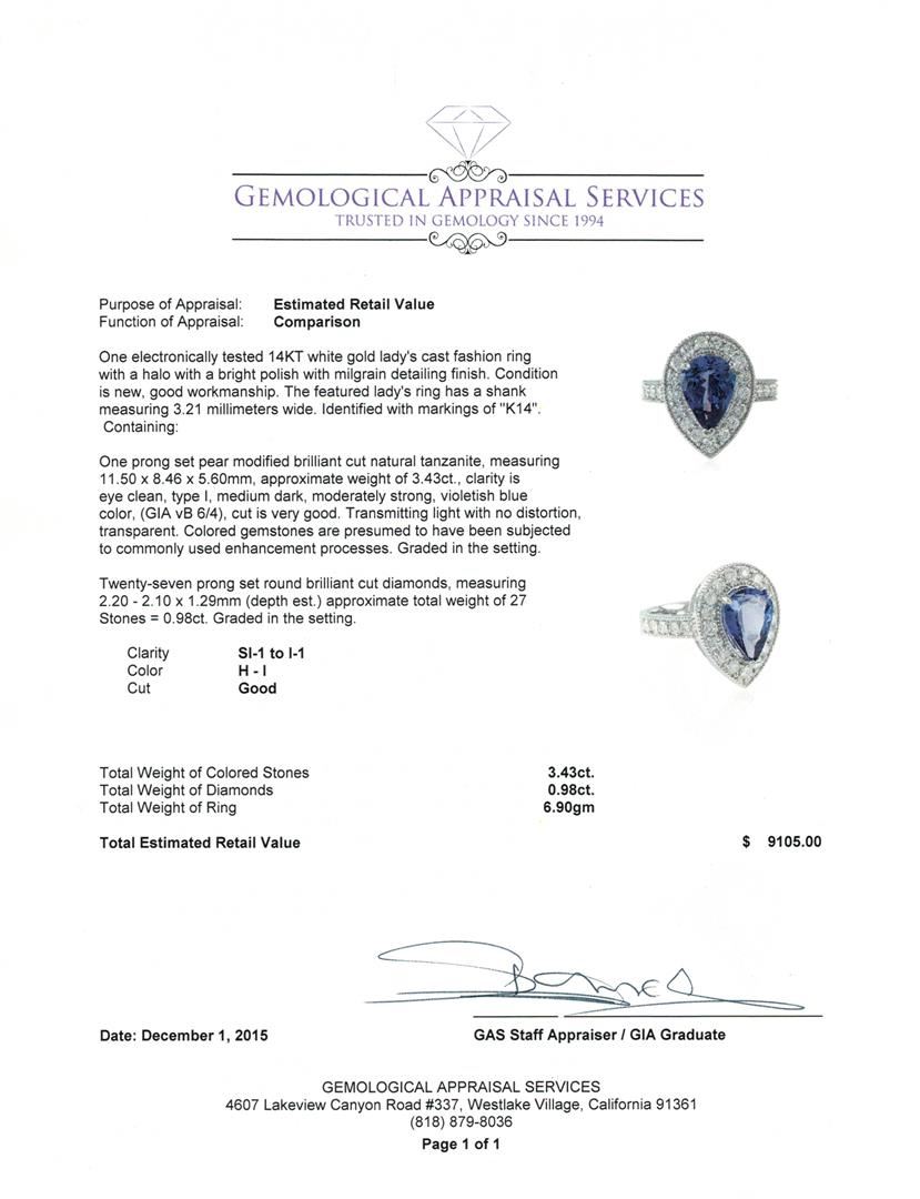 One electronically tested 14KT white gold lady's cast fashion ring with a halo with a bright polish with milgrain detailing finish. The featured lady's ring has a shank measuring 3.21 millimeters wide. Identified with markings of "K14". Condition is new, good workmanship. Containing: One prong set pear modified brilliant cut natural tanzanite, measuring 11.50 x 8.46 x 5.60mm, approximate weight of 3.43ct., clarity is eye clean, type I, medium dark, moderately strong, violetish blue color, (GIA vB 6/4), cut is very good. Transmitting light with no distortion, transparent. Colored gemstones are presumed to have been subjected to commonly used enhancement processes. Graded in the setting. Twenty-Seven prong set round brilliant cut diamonds, measuring 2.20 - 2.10 x 1.29mm (depth est.) approximate total weight of 27 Stones = 0.98ct. Graded in the setting. Clarity: SI-1 to I-1 . Color: H - I. Cut Good. Total Weight of Colored Stones 3.43ct.. Total Weight of Diamonds 0.98ct.. Total Weight of Ring 6.90gm at $ 9105.00 GAS Appraised.