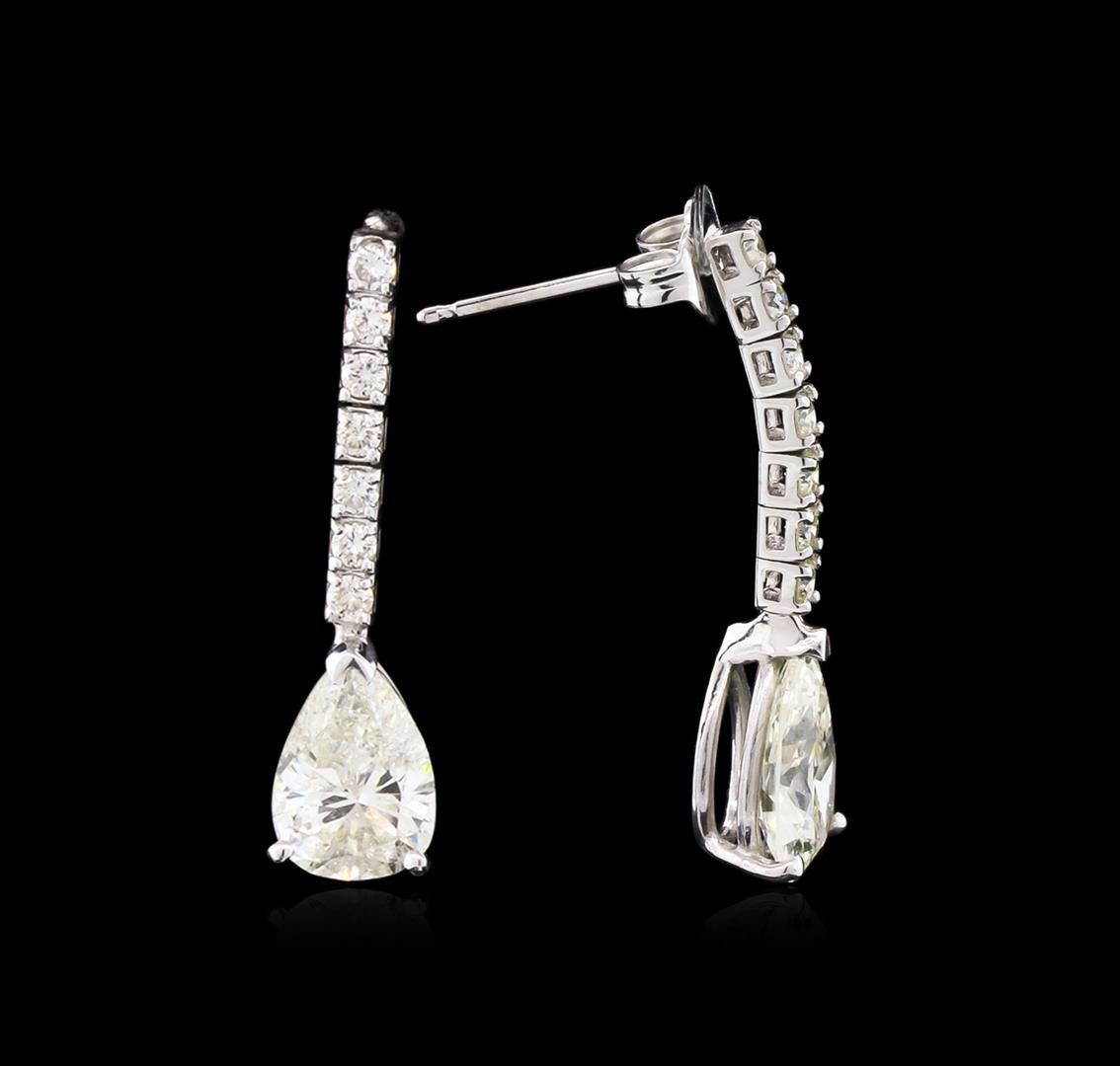 One pair electronically tested 14KT white gold lady's combination cast & assembled drop style earrings with friction posts with a bright polish finish. The featured earrings have a 1 inch straight line drop motif. Identified with markings of "14K". Condition is used, good workmanship. Containing: Two prong set pear shaped cut diamonds, measuring 9.70 x 6.60 x 3.90mm (depth est.) approximate. Total Weight of 2 Stones = 3.05ct. Graded in the setting. Clarity: VS-2 to SI-2. Color: I - Very Good Fourteen prong set round brilliant cut diamonds, measuring 2.00 - 1.90 x 1.17mm (depth est.) approximate. Total Weight of 14 Stones = 0.38ct. Graded in the setting. Clarity: SI-1 to SI-2. Color: H - I. Cut Good. Total Weight of Diamonds 3.43ct. Total Weight of Earrings 3.00gm. GAS Appraised.