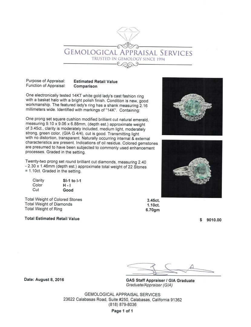 One electronically tested 14KT white gold lady's cast fashion ring with a basket halo with a bright polish finish. The featured lady's ring has a shank measuring 2.16 millimeters wide. Identified with markings of '14K'. Condition is new, good workmanship. Containing: One prong set square cushion modified brilliant cut natural emerald, measuring 9.10 x 9.06 x 6.88mm, (depth est.) approximate weight of 3.45ct., clarity is moderately included, medium light, moderately strong, green color, (GIA G 4/4), cut is good. Transmitting light with no distortion, transparent. Naturally occurring internal & external characteristics are present. Indications of oil residue. Colored gemstones are presumed to have been subjected to commonly used enhancement processes. Graded in the setting. Twenty-Two prong set round brilliant cut diamonds, measuring 2.40 - 2.30 x 1.46mm (depth est.) approximate total weight of 22 Stones = 1.10ct. Graded in the setting. Clarity SI-1 to I-1. Color: H - I Cut Good. Total Weight of Colored Stones 3.45ct.. Total Weight of Diamonds 1.10ct.. Total Weight of Ring 6.70gm. GAS Appraised at $9,010.00.