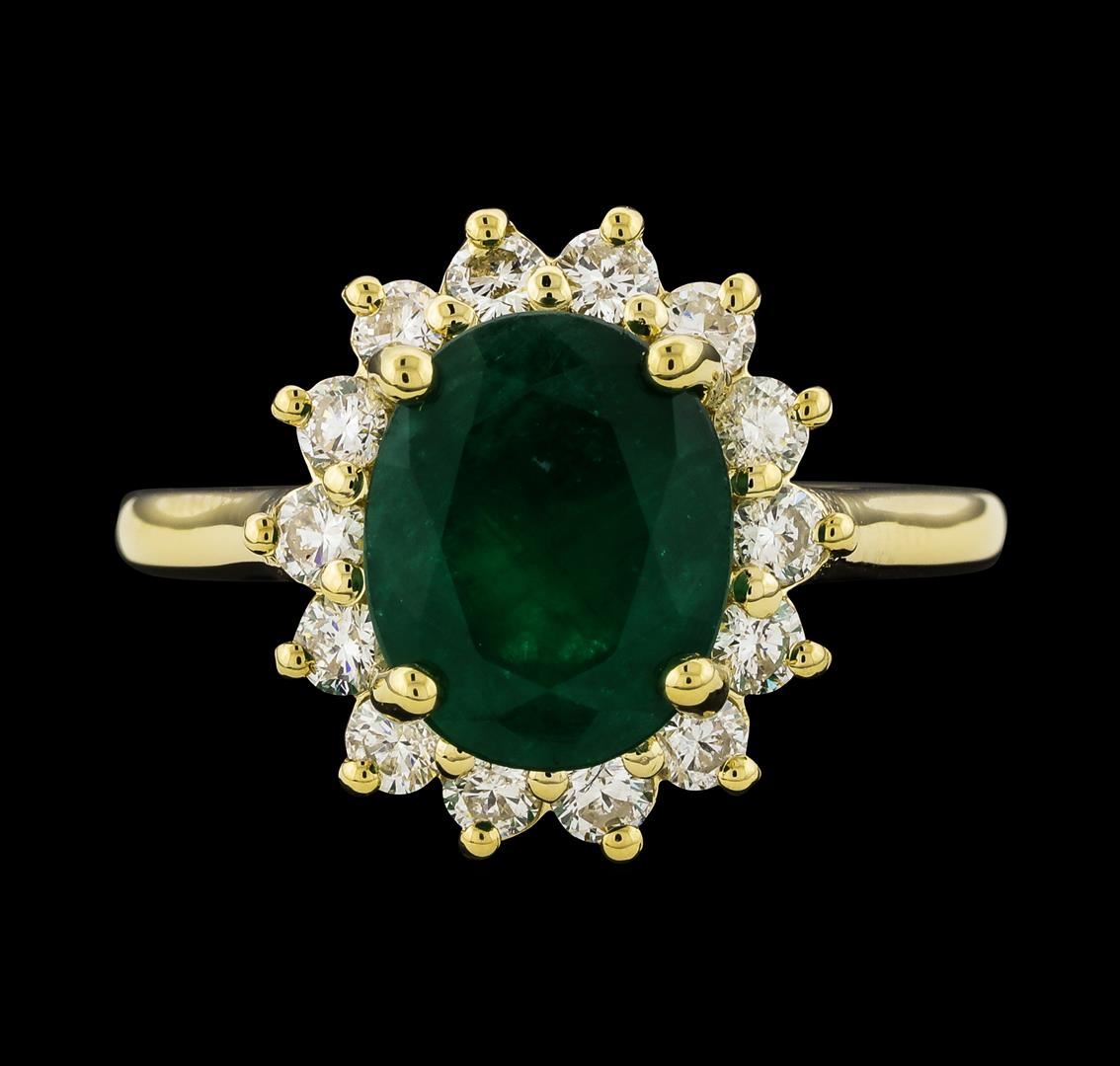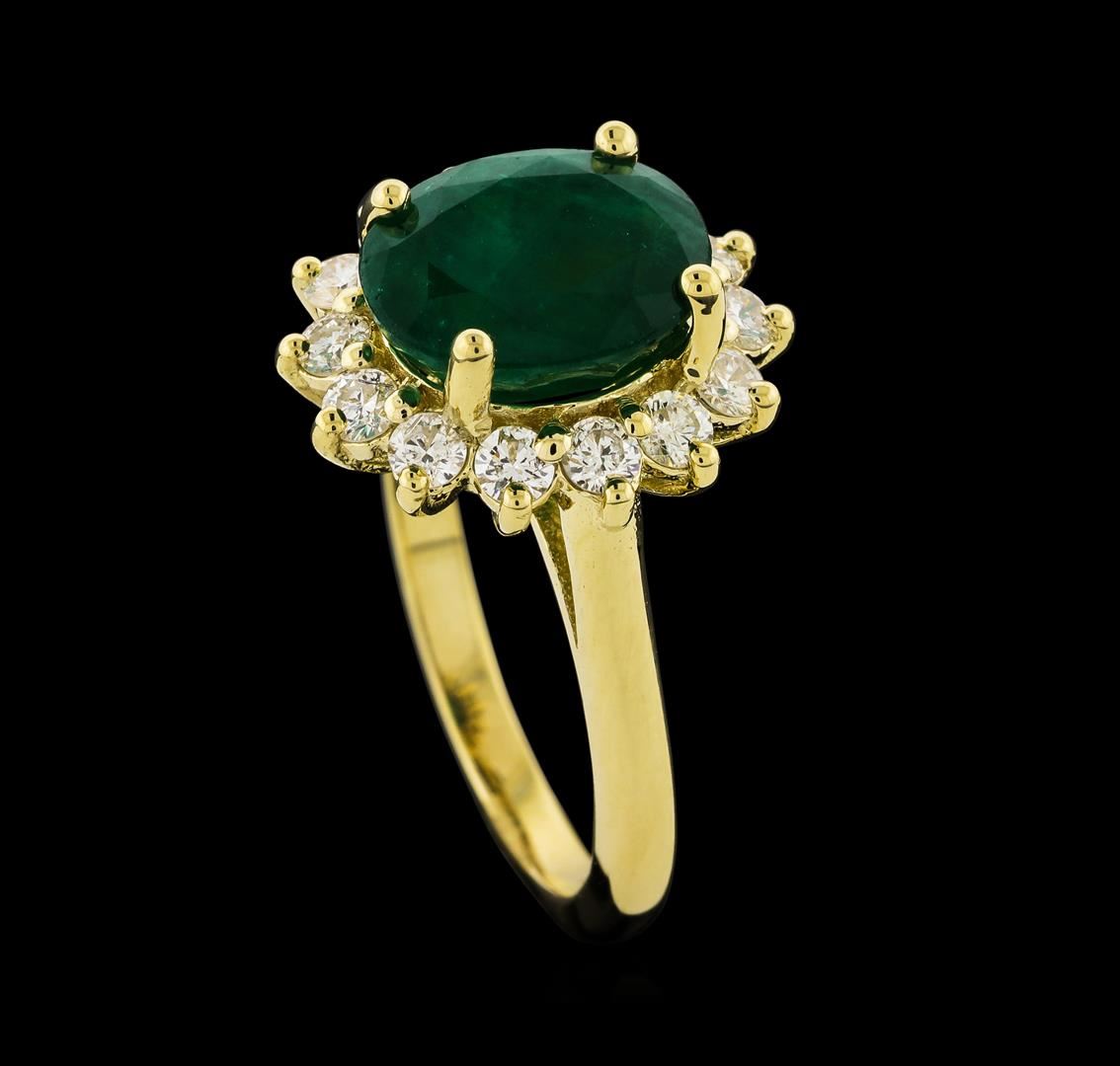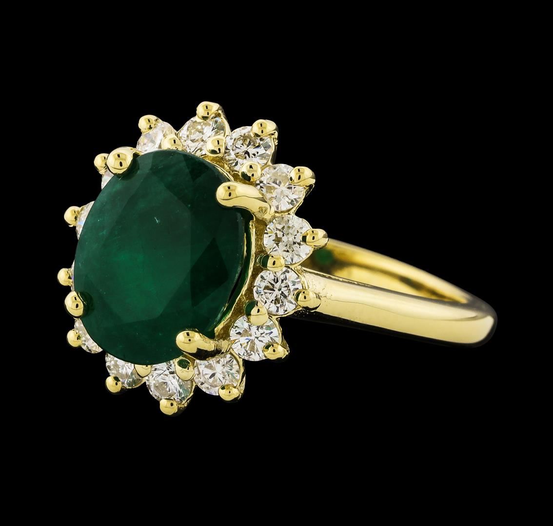 One electronically tested 14KT yellow gold lady's cast fashion ring with a basket halo with a bright polish finish. The featured lady's ring has a shank measuring 2.10 millimeters wide. Identified with markings of '14K'. Condition is new, good workmanship. Containing: One prong set oval modified mixed cut natural emerald, measuring 10.45 x 8.35 x 6.17mm, (depth est.) 10%. bulge factor, approximate weight of 3.45ct., clarity is heavily included, medium dark, moderately strong, green color, (GIA G 6/4), cut is good. Transmitting light somewhat diffusely, semi-transparent to translucent. Naturally occurring internal & external characteristics are present. Indications of oil residue. Colored gemstones are presumed to have been subjected to commonly used enhancement processes. Graded in the setting. Fourteen prong set round brilliant cut diamonds, measuring 2.40 - 2.30 x 1.46mm (depth est.) approximate total weight of 14 Stones = 0.70ct. Graded in the setting. Clarity SI-1 to SI-2. Color: H - I Cut Good. Total Weight of Colored Stones 3.45ct.. Total Weight of Diamonds 0.70ct.. Total Weight of Ring 5.40gm GAS Appraised at $4,890.00.