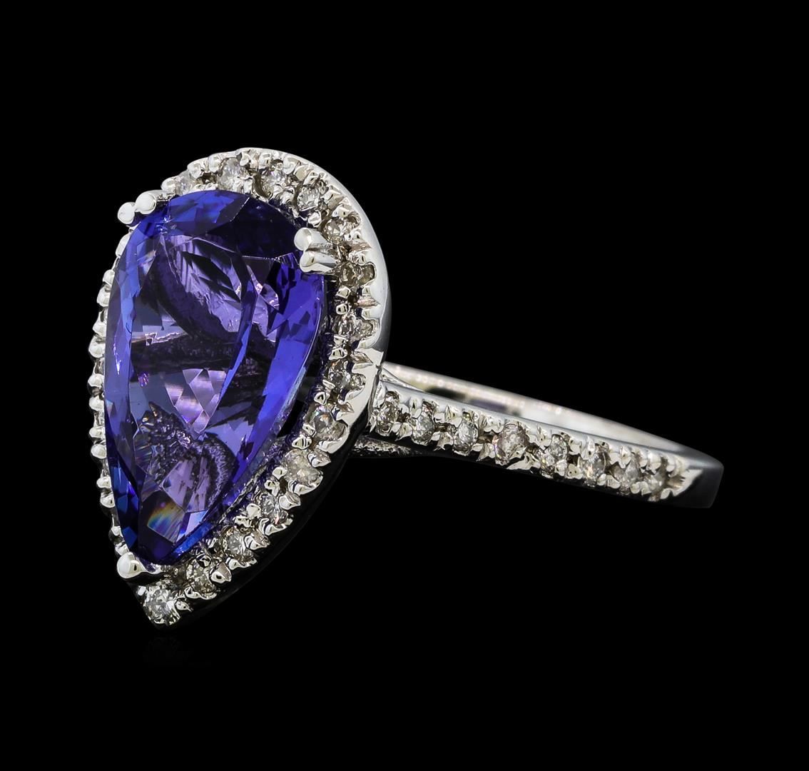 One electronically tested 14KT white gold lady's cast fashion ring with a cathedral halo with a bright polish finish. The featured lady's ring has a shank measuring 1.80 millimeters wide. Identified with markings of '14K'. Condition is new, good workmanship. Containing: One prong set pear modified brilliant cut natural tanzanite, measuring 12.65 x 8.04 x 5.00mm, (depth est.) approximate weight of 3.45ct., clarity is eye clean, medium dark, moderately strong, violetish blue color, (GIA vB 6/4), cut is very good. Transmitting light with no distortion, transparent. Colored gemstones are presumed to have been subjected to commonly used enhancement processes. Graded in the setting. Thirty-Eight prong set round brilliant cut diamonds, measuring 1.40 - 1.30 x 0.84mm (depth est.) approximate total weight of 38 Stones = 0.35ct. Graded in the setting. Clarity SI-1 to I-1. Color: G - I Cut Good. Total Weight of Colored Stones 3.45ct.. Total Weight of Diamonds 0.35ct.. Total Weight of Ring 4.20gm. GAS Appraised at $7,655.00.