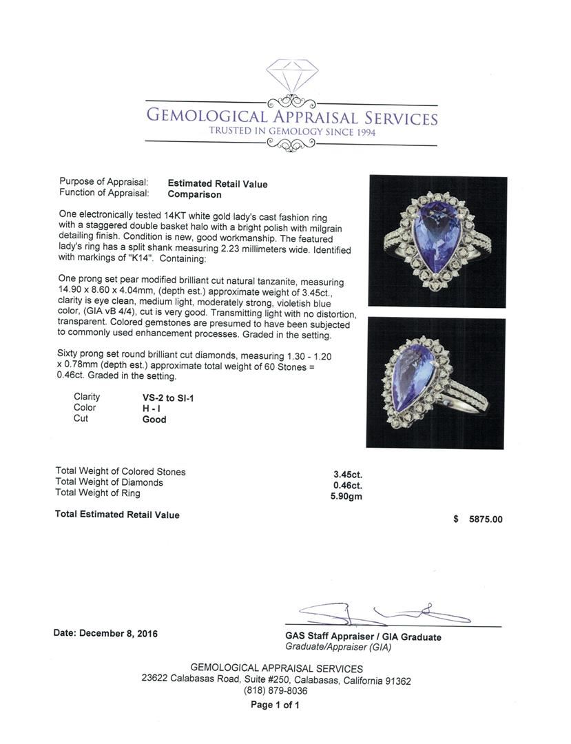 One electronically tested 14KT white gold lady's cast fashion ring with a staggered double basket halo with a bright polish with milgrain detailing finish. The featured lady's ring has a split shank measuring 2.23 millimeters wide. Identified with markings of 'K14'. Condition is new, good workmanship. Containing: One prong set pear modified brilliant cut natural tanzanite, measuring 14.90 x 8.60 x 4.04mm, (depth est.) approximate weight of 3.45ct., clarity is eye clean, medium light, moderately strong, violetish blue color, (GIA vB 4/4), cut is very good. Transmitting light with no distortion, transparent. Colored gemstones are presumed to have been subjected to commonly used enhancement processes. Graded in the setting. Sixty prong set round brilliant cut diamonds, measuring 1.30 - 1.20 x 0.78mm (depth est.) approximate total weight of 60 Stones = 0.46ct. Graded in the setting. Clarity VS-2 to SI-1. Color: H - I Cut Good. Total Weight of Colored Stones 3.45ct.. Total Weight of Diamonds 0.46ct.. Total Weight of Ring 5.90gm. GAS Appraised at $5,875.00.
