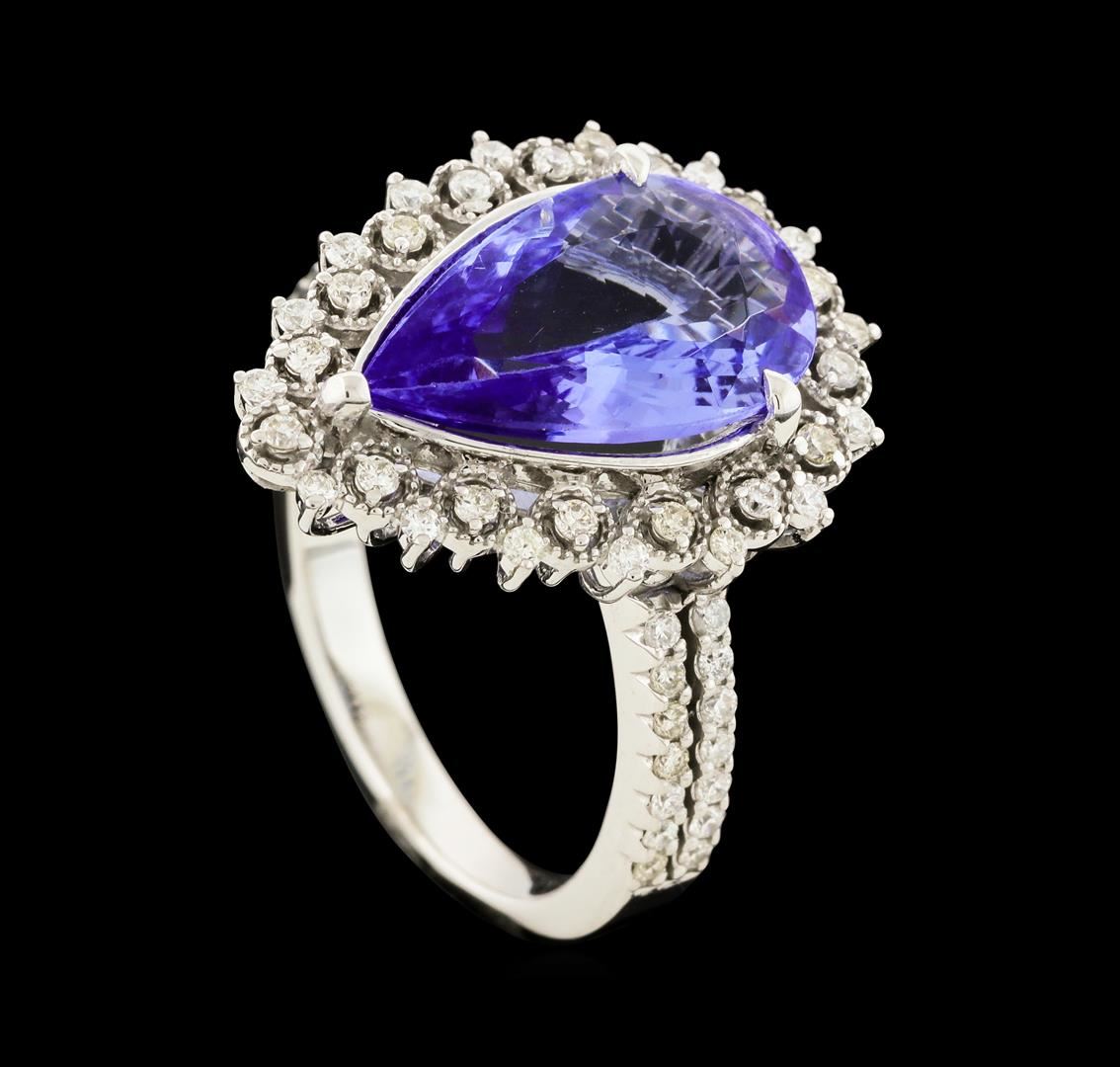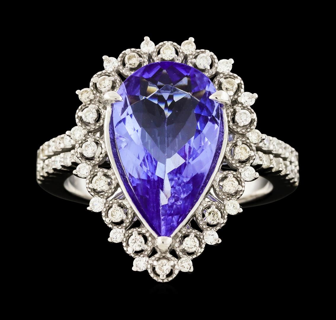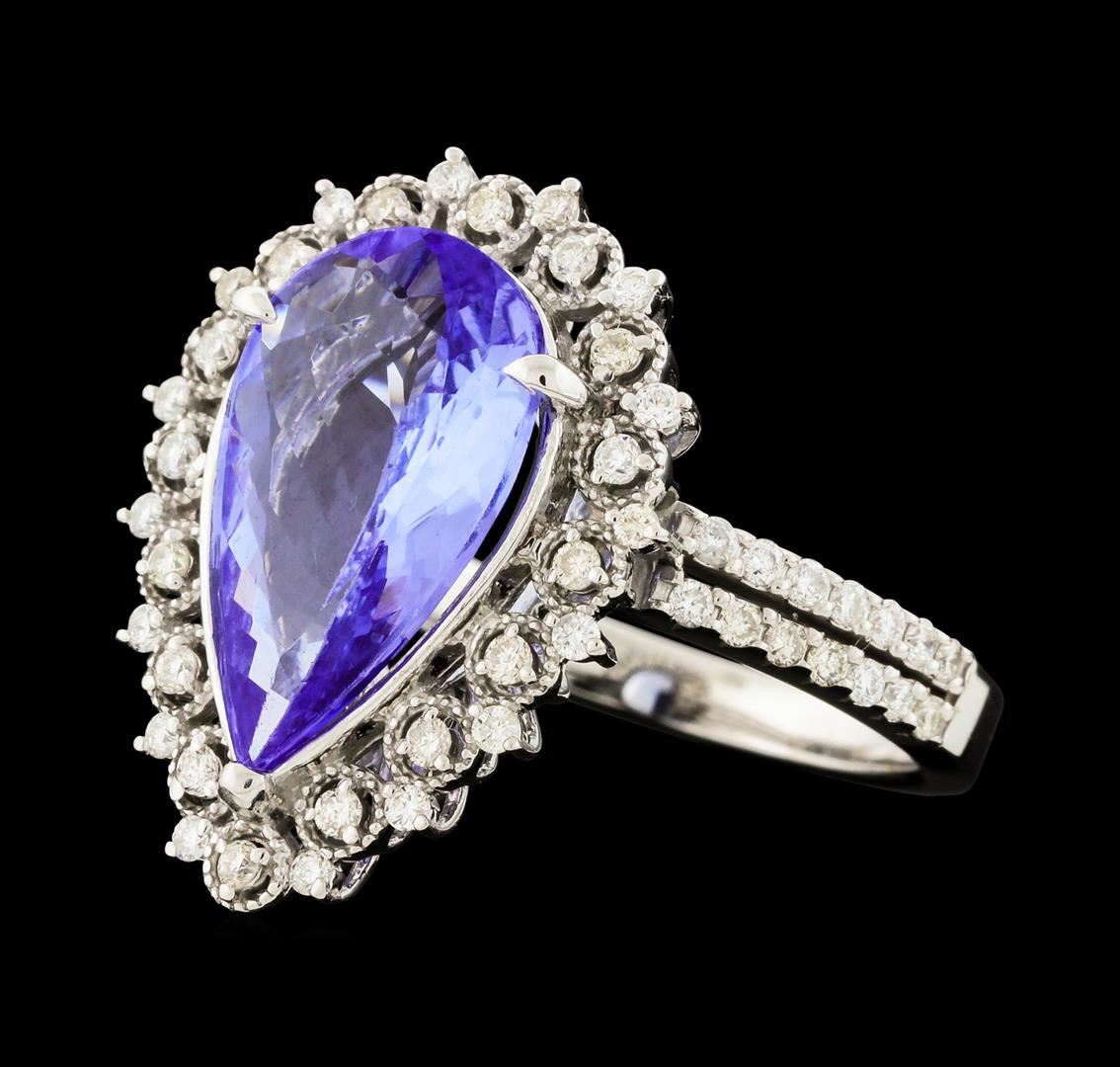 One electronically tested 14KT white gold lady's cast fashion ring with a staggered double basket halo with a bright polish with milgrain detailing finish. The featured lady's ring has a split shank measuring 2.23 millimeters wide. Identified with markings of 'K14'. Condition is new, good workmanship. Containing: One prong set pear modified brilliant cut natural tanzanite, measuring 14.90 x 8.60 x 4.04mm, (depth est.) approximate weight of 3.45ct., clarity is eye clean, medium light, moderately strong, violetish blue color, (GIA vB 4/4), cut is very good. Transmitting light with no distortion, transparent. Colored gemstones are presumed to have been subjected to commonly used enhancement processes. Graded in the setting. Sixty prong set round brilliant cut diamonds, measuring 1.30 - 1.20 x 0.78mm (depth est.) approximate total weight of 60 Stones = 0.46ct. Graded in the setting. Clarity VS-2 to SI-1. Color: H - I Cut Good. Total Weight of Colored Stones 3.45ct.. Total Weight of Diamonds 0.46ct.. Total Weight of Ring 5.90gm. GAS Appraised at $5,875.00.