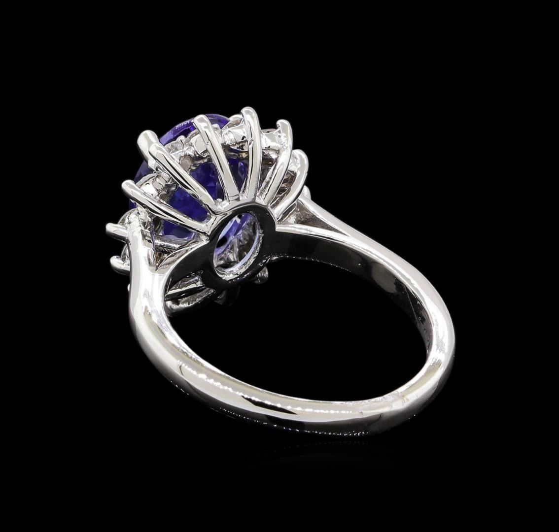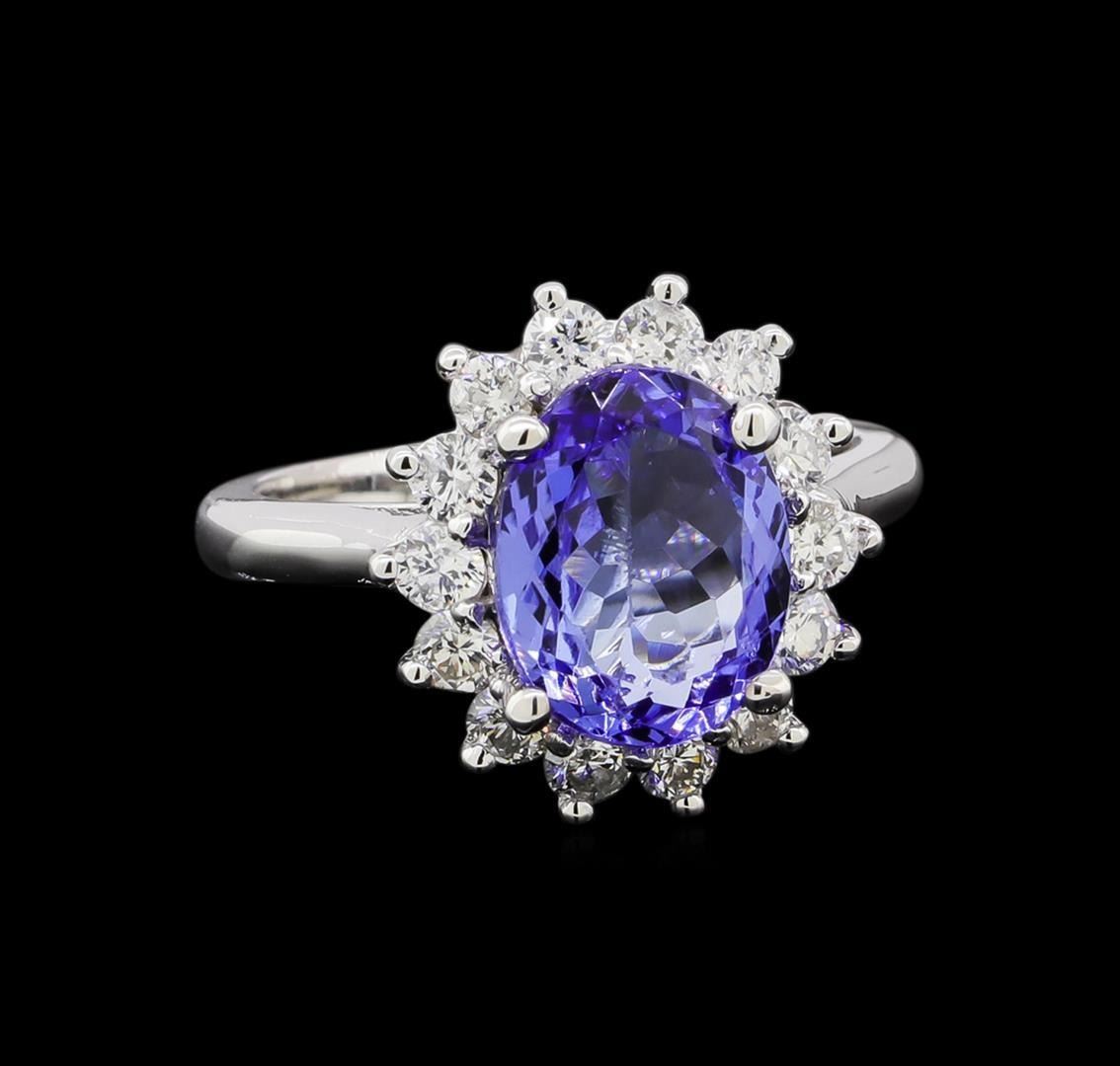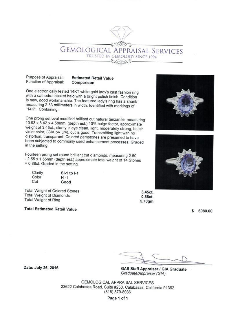 One electronically tested 14KT white gold lady's cast fashion ring with a cathedral basket halo with a bright polish finish. The featured lady's ring has a shank measuring 2.33 millimeters in width. Identified with markings of '14K'. Condition is new, good workmanship. Containing: One prong set oval modified brilliant cut natural tanzanite, measuring 10.93 x 8.42 x 4.58mm, (depth est.) 10%. bulge factor, approximate weight of 3.45ct., clarity is eye clean, light, moderately strong, bluish violet color, (GIA bV 3/4), cut is good. Transmitting light with no distortion, transparent. Colored gemstones are presumed to have been subjected to commonly used enhancement processes. Graded in the setting. Fourteen prong set round brilliant cut diamonds, measuring 2.60 - 2.55 x 1.55mm (depth est.) approximate total weight of 14 Stones = 0.88ct. Graded in the setting. Clarity SI-1 to I-1. Color: H - I Cut Good. Total Weight of Colored Stones 3.45ct.. Total Weight of Diamonds 0.88ct.. Total Weight of Ring 5.70gm. GAS Appraised.