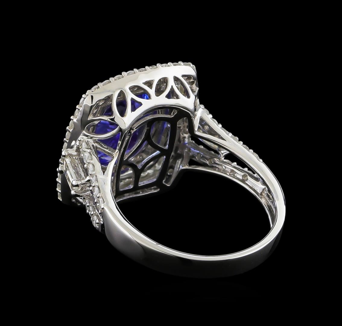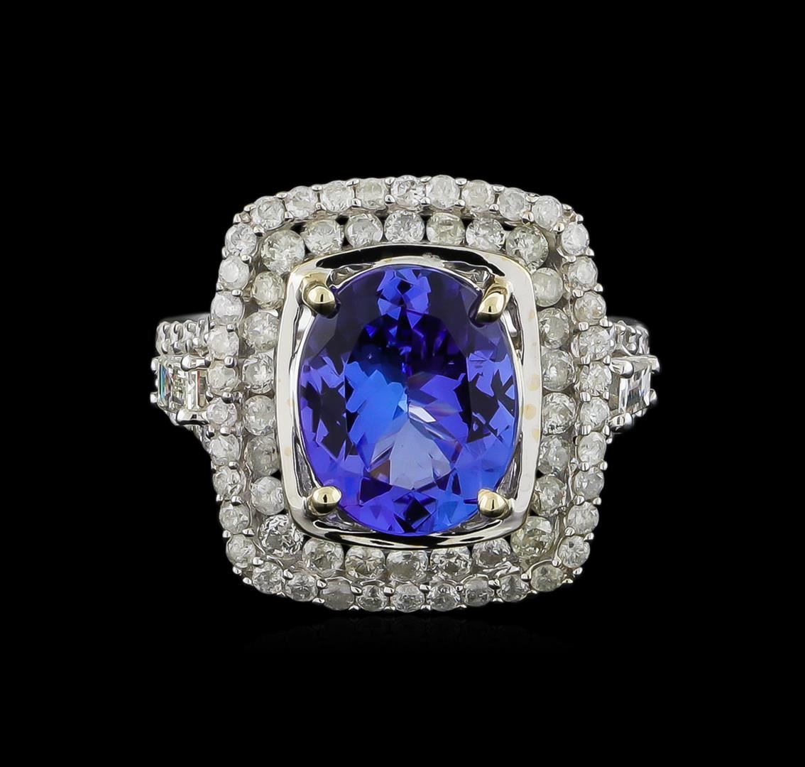 One electronically tested 14KT white gold ladies cast tanzanite and diamond ring with a bright polish finish. The featured tanzanite is set within tiered diamond bezels supported by diamond set split shoulders, completed by a two and one-half millimeter wide band. Trademark is Orianne. Identified with markings of "14K". Condition is new, good workmanship. Containing: One prong set oval mixed cut natural tanzanite, measuring 11.15 x 8.98 x 4.75mm, approximate weight of 3.45ct., clarity is eye clean, type I, medium dark, very slightly grayish, bluish violet color, (GIA bV 6/3), cut is good. Transmitting light with no distortion, transparent. Graded in the setting. Tanzanite is a very rare gemstone that is only found in the country of Tanzania. Originally discovered in 1967. Tiffany & Company, named the stone Tanzanite. It is found in the Usumburu Mountains that border the Umba Valley of northern Tanzania. Tanzanite occurs in gray, brown, violet, blue, reddish-purple, & green. The gem is interesting because of its exceptional pleochroism. Rotated in different directions a tanzanite will exhibit multiple changes of color. Tanzanite has a low tolerance to ultrasonic cleaning, and should not be cleaned using this method. Eighty-Eight prong & channel set round brilliant cut diamonds, measuring 1.90 - 1.40 x 0.99mm (depth est.) approximate total weight of 88 Stones = 1.44ct. Graded in the setting. Clarity: I-2 to I-3. Color: H - J Two prong set baguette cut diamonds, measuring from 4.20 x 2.10 x 1.47mm (depth est.) to 4.30 x 2.15 x 1.51mm (depth est.) approximate total weight of 2 Stones = 0.24ct. Graded in the setting. Clarity: VS-1. Color: H - I. Total Weight of Colored Stones 3.45ct. Total Weight of Diamonds 1.68ct. Total Weight of Ring 5.98gm. AIG Appraised at $11,895.00.