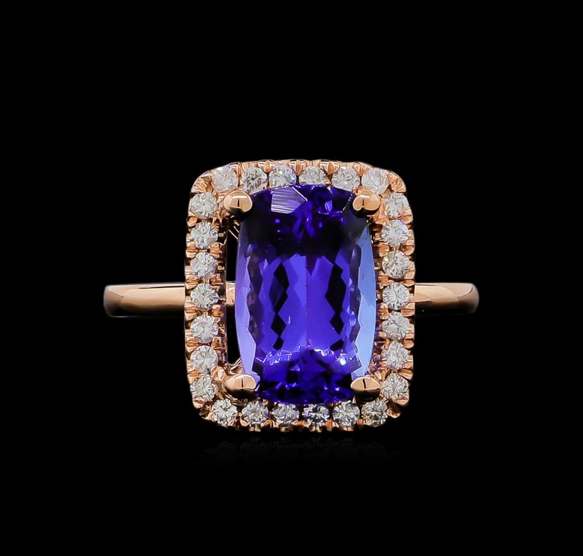 One ring featuring: 14KT rose gold weighing 3.74 grams containing one tanzanite with a total weight of 3.46ct and side diamonds with a total weight of 0.32ct.