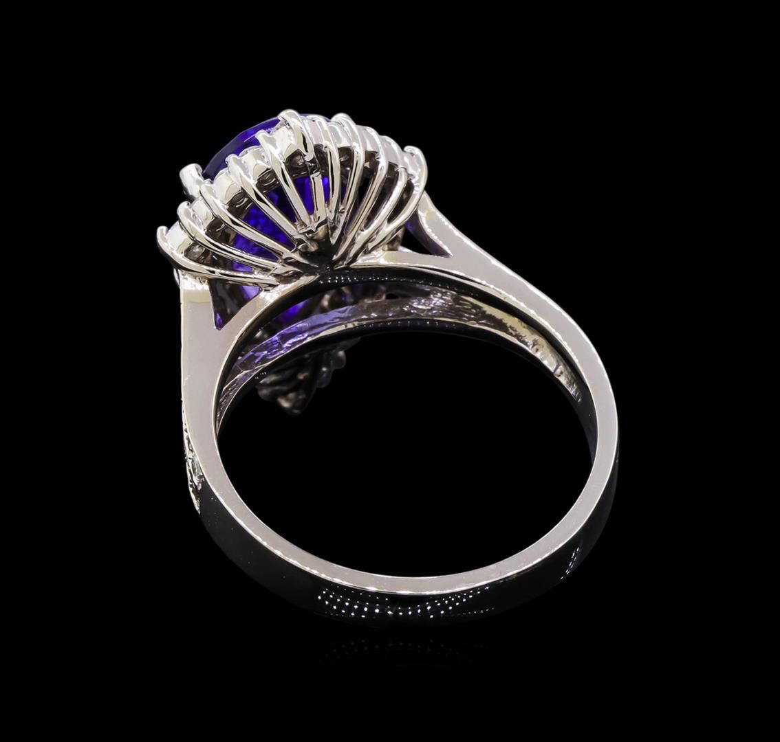 One electronically tested 14KT white gold lady's cast fashion ring with a split shank halo with a bright polish finish. The featured lady's ring has a shank measuring 2.92 millimeters in width. Identified with markings of "K14". Condition is new, good workmanship. Containing: One prong set pear modified brilliant cut natural tanzanite, measuring 12.50 x 7.90 x 5.00mm, (depth est.) 3%. bulge factor, approximate weight of 3.46ct., clarity is eye clean, medium dark, moderately strong, bluish violet color, (GIA bV 6/4), cut is good. Transmitting light with no distortion, transparent. Colored gemstones are presumed to have been subjected to commonly used enhancement processes. Graded in the setting. Four prong set round brilliant cut diamonds, measuring 2.35 - 2.30 x 1.40mm (depth est.) approximate total weight of 4 Stones = 0.18ct. Graded in the setting. Clarity: SI-1 to SI-2. Color: H - I. Cut Good Twenty prong set round brilliant cut diamonds, measuring 1.50 - 1.40 x 0.90mm (depth est.) approximate total weight of 20 Stones = 0.25ct. Graded in the setting. Clarity: SI-1 to SI-2. Color: G - Good Twenty-Eight bead set round brilliant cut diamonds, measuring 1.35 - 1.30 x 0.80mm (depth est.) approximate total weight of 28 Stones = 0.25ct. Graded in the setting. Clarity: SI-1 to SI-2. Color: G - I. Cut Good. Total Weight of Colored Stones 3.46ct. Total Weight of Diamonds 0.68ct. Total Weight of Ring 5.80gm. GAS Appraised at $8,405.00.