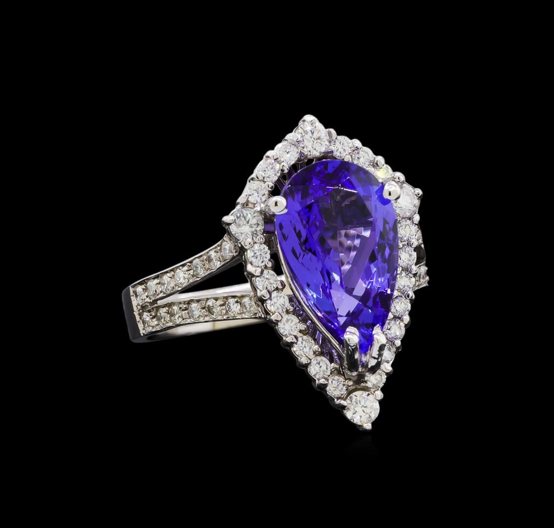 One electronically tested 14KT white gold lady's cast fashion ring with a split shank halo with a bright polish finish. The featured lady's ring has a shank measuring 2.92 millimeters in width. Identified with markings of "K14". Condition is new, good workmanship. Containing: One prong set pear modified brilliant cut natural tanzanite, measuring 12.50 x 7.90 x 5.00mm, (depth est.) 3%. bulge factor, approximate weight of 3.46ct., clarity is eye clean, medium dark, moderately strong, bluish violet color, (GIA bV 6/4), cut is good. Transmitting light with no distortion, transparent. Colored gemstones are presumed to have been subjected to commonly used enhancement processes. Graded in the setting. Four prong set round brilliant cut diamonds, measuring 2.35 - 2.30 x 1.40mm (depth est.) approximate total weight of 4 Stones = 0.18ct. Graded in the setting. Clarity: SI-1 to SI-2. Color: H - I. Cut Good Twenty prong set round brilliant cut diamonds, measuring 1.50 - 1.40 x 0.90mm (depth est.) approximate total weight of 20 Stones = 0.25ct. Graded in the setting. Clarity: SI-1 to SI-2. Color: G - Good Twenty-Eight bead set round brilliant cut diamonds, measuring 1.35 - 1.30 x 0.80mm (depth est.) approximate total weight of 28 Stones = 0.25ct. Graded in the setting. Clarity: SI-1 to SI-2. Color: G - I. Cut Good. Total Weight of Colored Stones 3.46ct. Total Weight of Diamonds 0.68ct. Total Weight of Ring 5.80gm. GAS Appraised at $8,405.00.