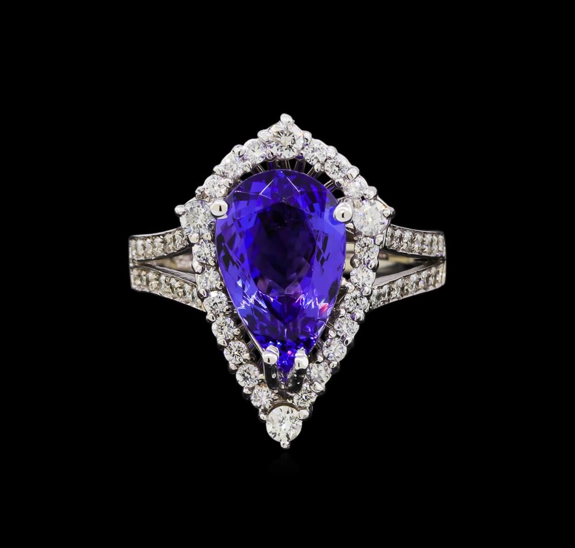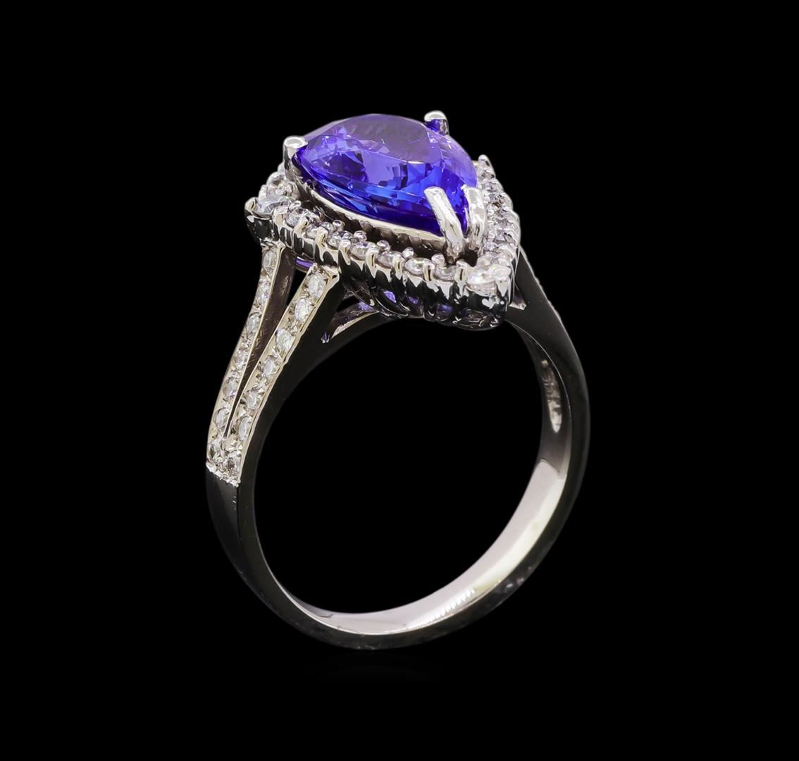 One electronically tested 14KT white gold lady's cast fashion ring with a split shank halo with a bright polish finish. The featured lady's ring has a shank measuring 2.92 millimeters in width. Identified with markings of "K14". Condition is new, good workmanship. Containing: One prong set pear modified brilliant cut natural tanzanite, measuring 12.50 x 7.90 x 5.00mm, (depth est.) 3%. bulge factor, approximate weight of 3.46ct., clarity is eye clean, medium dark, moderately strong, bluish violet color, (GIA bV 6/4), cut is good. Transmitting light with no distortion, transparent. Colored gemstones are presumed to have been subjected to commonly used enhancement processes. Graded in the setting. Four prong set round brilliant cut diamonds, measuring 2.35 - 2.30 x 1.40mm (depth est.) approximate total weight of 4 Stones = 0.18ct. Graded in the setting. Clarity: SI-1 to SI-2. Color: H - I. Cut Good Twenty prong set round brilliant cut diamonds, measuring 1.50 - 1.40 x 0.90mm (depth est.) approximate total weight of 20 Stones = 0.25ct. Graded in the setting. Clarity: SI-1 to SI-2. Color: G - Good Twenty-Eight bead set round brilliant cut diamonds, measuring 1.35 - 1.30 x 0.80mm (depth est.) approximate total weight of 28 Stones = 0.25ct. Graded in the setting. Clarity: SI-1 to SI-2. Color: G - I. Cut Good. Total Weight of Colored Stones 3.46ct. Total Weight of Diamonds 0.68ct. Total Weight of Ring 5.80gm. GAS Appraised at $8,405.00.