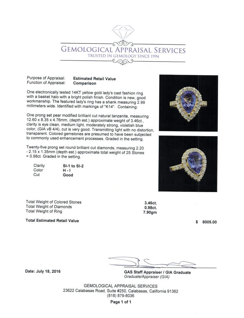 One electronically tested 14KT yellow gold lady's cast fashion ring with a basket halo with a bright polish finish. The featured lady's ring has a shank measuring 2.99 millimeters wide. Identified with markings of 'K14'. Condition is new, good workmanship. Containing: One prong set pear modified brilliant cut natural tanzanite, measuring 12.60 x 8.35 x 4.76mm, (depth est.) approximate weight of 3.46ct., clarity is eye clean, medium light, moderately strong, violetish blue color, (GIA vB 4/4), cut is very good. Transmitting light with no distortion, transparent. Colored gemstones are presumed to have been subjected to commonly used enhancement processes. Graded in the setting. Twenty-Five prong set round brilliant cut diamonds, measuring 2.20 - 2.15 x 1.35mm (depth est.) approximate total weight of 25 Stones = 0.98ct. Graded in the setting. Clarity SI-1 to SI-2. Color: H - I Cut Good. Total Weight of Colored Stones 3.46ct.. Total Weight of Diamonds 0.98ct.. Total Weight of Ring 7.90gm. GAS Appraised at $8,005.00.