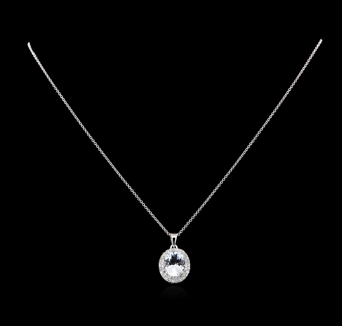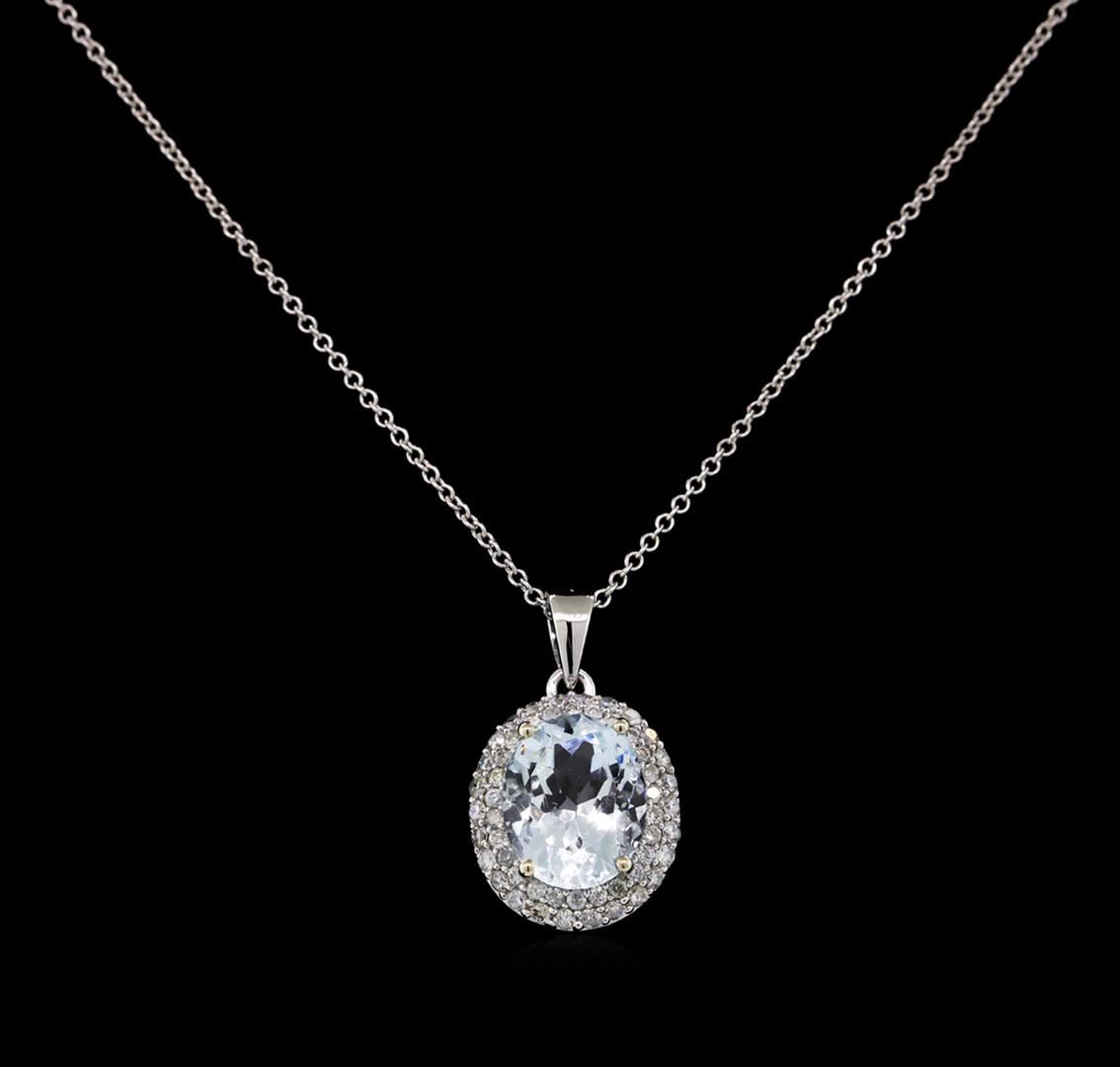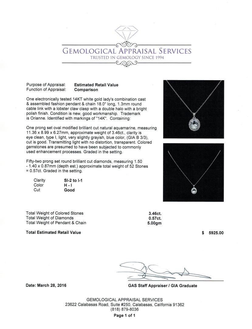 One electronically tested 14KT white gold lady's combination cast & assembled fashion pendant & chain 18.0" long, 1.3mm round cable link with a lobster claw clasp with a double halo with a bright polish finish. Trademark is Orianne. Identified with markings of "14K". Condition is new, good workmanship. Containing: One prong set oval modified brilliant cut natural aquamarine, measuring 11.36 x 8.99 x 6.27mm, approximate weight of 3.46ct., clarity is eye clean, type I, light, very slightly grayish, blue color, (GIA B 3/3), cut is good. Transmitting light with no distortion, transparent. Colored gemstones are presumed to have been subjected to commonly used enhancement processes. Graded in the setting. Fifty-Two prong set round brilliant cut diamonds, measuring 1.50 - 1.40 x 0.87mm (depth est.) approximate total weight of 52 Stones = 0.57ct. Graded in the setting. Clarity: SI-2 to I-1. Color: H - I. Cut Good. Total Weight of Colored Stones 3.46ct. Total Weight of Diamonds 0.57ct. Total Weight of Pendant & Chain 5.00gm. GAS Appraised at $5,925.00.