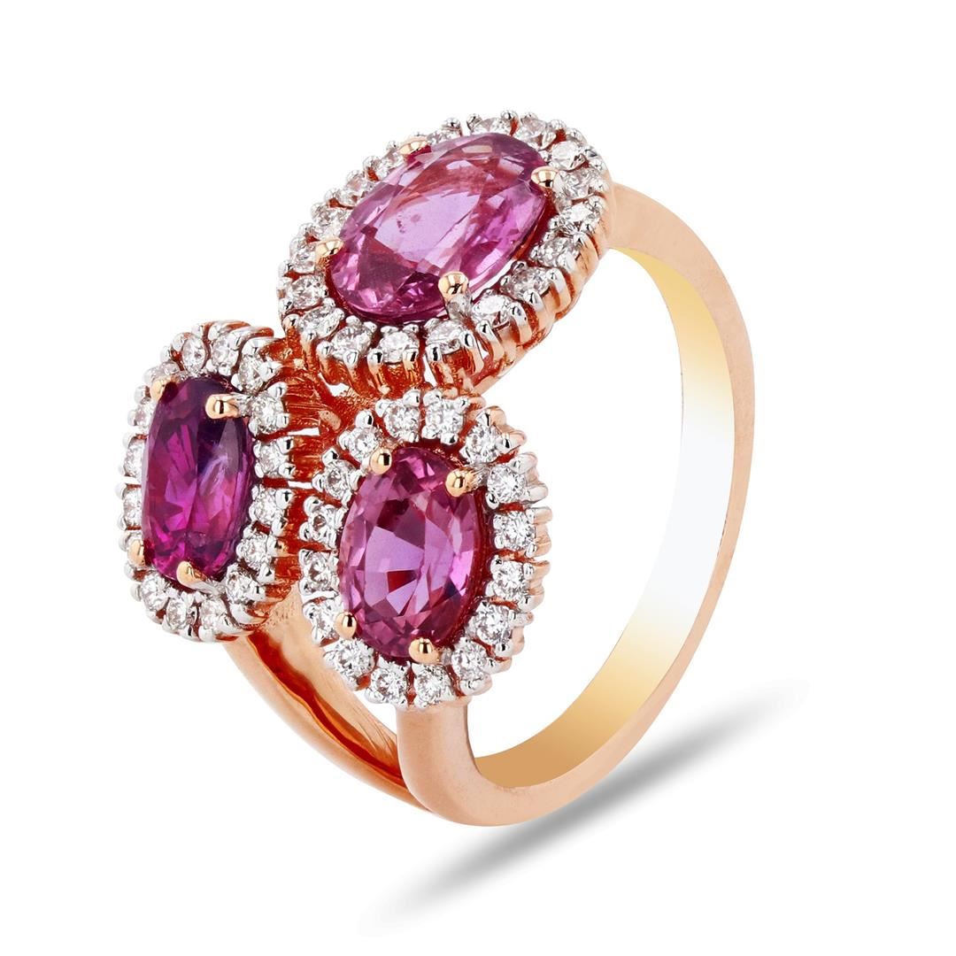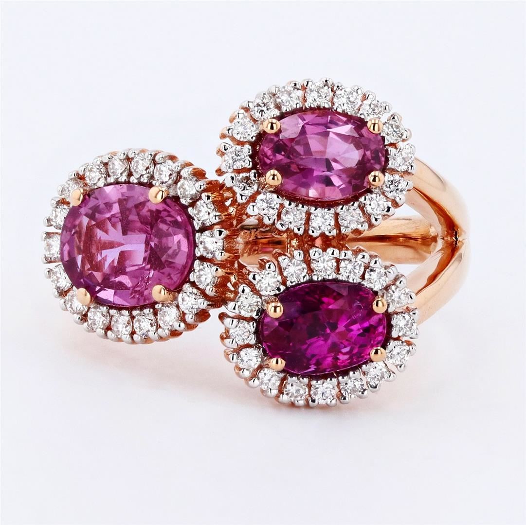 One electronically tested 18KT rose gold cast purple sapphire & diamond ring. Each of the featured sapphires are set within a diamond bezel, supported by a ribbed under gallery, completed by a two millimeter wide band. Bright polish finish. Trademark is