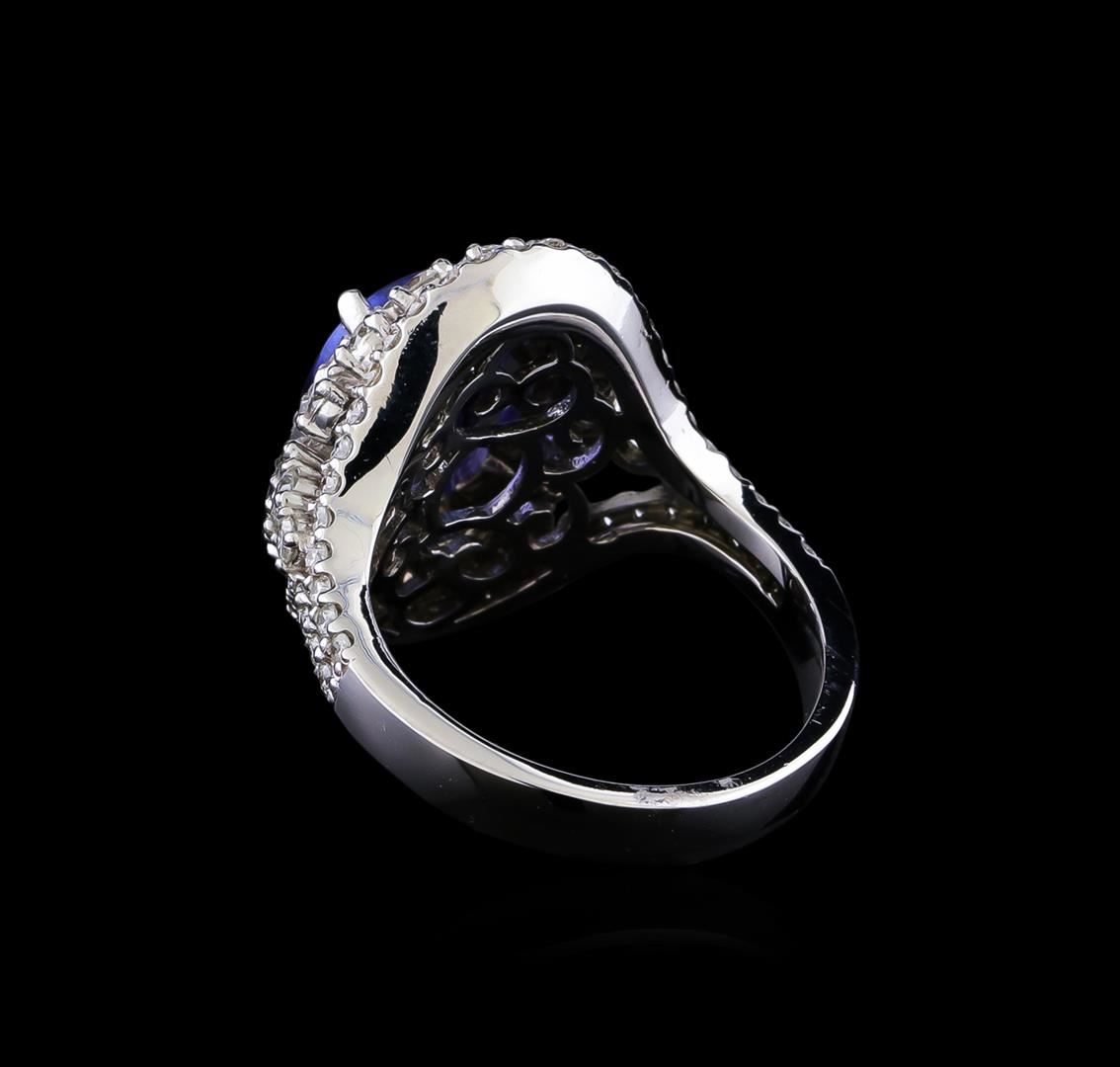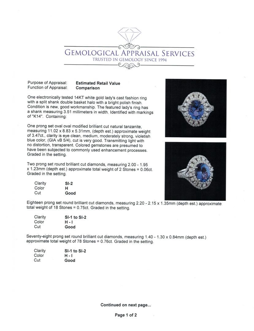 One electronically tested 14KT white gold lady's cast fashion ring with a split shank double basket halo with a bright polish finish. The featured lady's ring has a shank measuring 3.51 millimeters in width. Identified with markings of "K14". Condition is new, good workmanship. Containing: One prong set oval oval modified brilliant cut natural tanzanite, measuring 11.02 x 8.83 x 5.31mm, (depth est.) approximate weight of 3.47ct., clarity is eye clean, medium, moderately strong, violetish blue color, (GIA vB 5/4), cut is very good. Transmitting light with no distortion, transparent. Colored gemstones are presumed to have been subjected to commonly used enhancement processes. Graded in the setting. Two prong set round brilliant cut diamonds, measuring 2.00 - 1.95 x 1.23mm (depth est.) approximate total weight of 2 Stones = 0.06ct. Graded in the setting. Clarity: SI-2. Color: Good Eighteen prong set round brilliant cut diamonds, measuring 2.20 - 2.15 x 1.35mm (depth est.) approximate total weight of 18 Stones = 0.75ct. Graded in the setting. Clarity: SI-1 to SI-2. Color: H - I. Cut Good Seventy-Eight prong set round brilliant cut diamonds, measuring 1.40 - 1.30 x 0.84mm (depth est.) approximate total weight of 78 Stones = 0.76ct. Graded in the setting. Clarity: SI-1 to SI-2. Color: H - I. Cut Good. Total Weight of Colored Stones 3.47ct. Total Weight of Diamonds 1.57ct. Total Weight of Ring 8.40gm. GAS Appraised at $10,915.00.