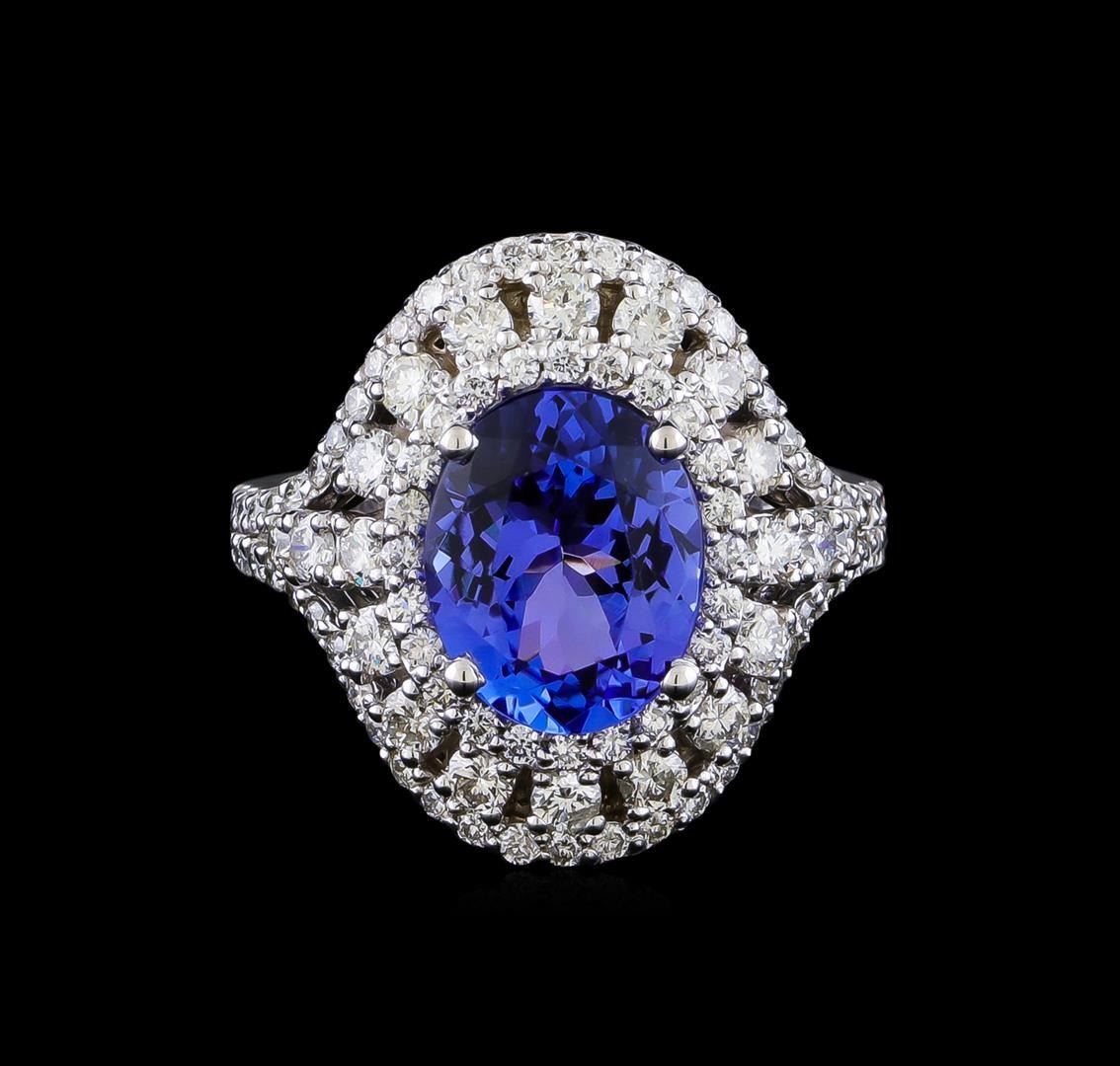 One electronically tested 14KT white gold lady's cast fashion ring with a split shank double basket halo with a bright polish finish. The featured lady's ring has a shank measuring 3.51 millimeters in width. Identified with markings of "K14". Condition is new, good workmanship. Containing: One prong set oval oval modified brilliant cut natural tanzanite, measuring 11.02 x 8.83 x 5.31mm, (depth est.) approximate weight of 3.47ct., clarity is eye clean, medium, moderately strong, violetish blue color, (GIA vB 5/4), cut is very good. Transmitting light with no distortion, transparent. Colored gemstones are presumed to have been subjected to commonly used enhancement processes. Graded in the setting. Two prong set round brilliant cut diamonds, measuring 2.00 - 1.95 x 1.23mm (depth est.) approximate total weight of 2 Stones = 0.06ct. Graded in the setting. Clarity: SI-2. Color: Good Eighteen prong set round brilliant cut diamonds, measuring 2.20 - 2.15 x 1.35mm (depth est.) approximate total weight of 18 Stones = 0.75ct. Graded in the setting. Clarity: SI-1 to SI-2. Color: H - I. Cut Good Seventy-Eight prong set round brilliant cut diamonds, measuring 1.40 - 1.30 x 0.84mm (depth est.) approximate total weight of 78 Stones = 0.76ct. Graded in the setting. Clarity: SI-1 to SI-2. Color: H - I. Cut Good. Total Weight of Colored Stones 3.47ct. Total Weight of Diamonds 1.57ct. Total Weight of Ring 8.40gm. GAS Appraised at $10,915.00.