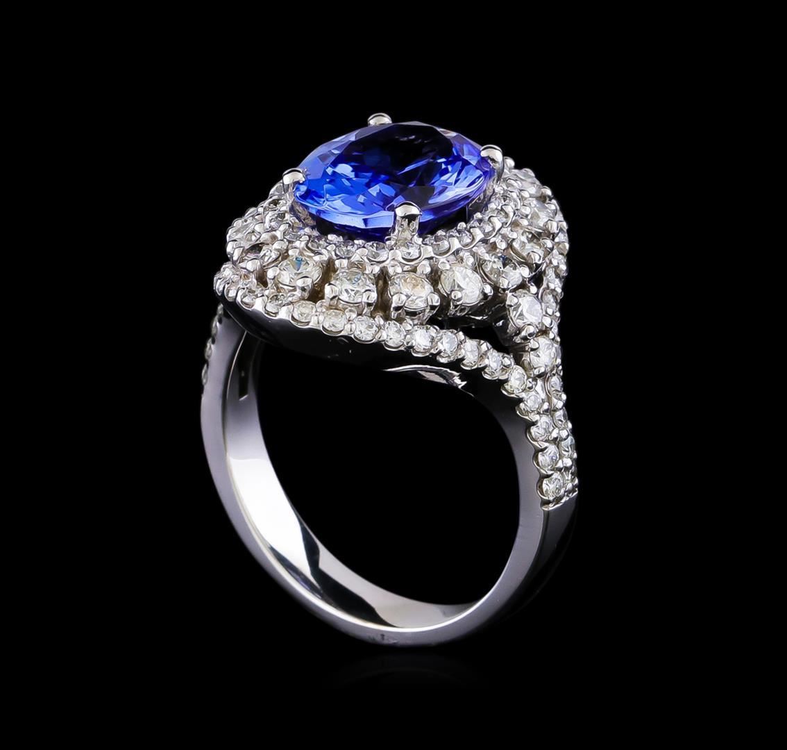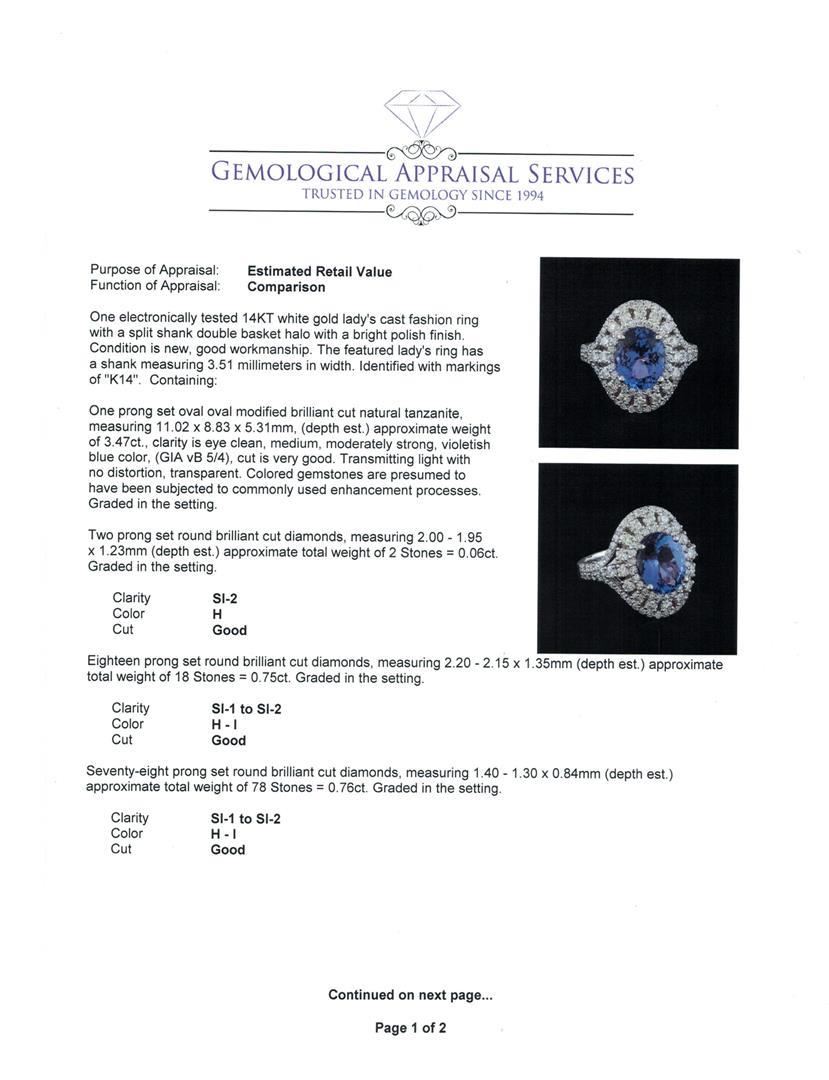 One electronically tested 14KT white gold lady's cast fashion ring with a split shank double basket halo with a bright polish finish. The featured lady's ring has a shank measuring 3.51 millimeters in width. Identified with markings of "K14". Condition is new, good workmanship. Containing: One prong set oval oval modified brilliant cut natural tanzanite, measuring 11.02 x 8.83 x 5.31mm, (depth est.) approximate weight of 3.47ct., clarity is eye clean, medium, moderately strong, violetish blue color, (GIA vB 5/4), cut is very good. Transmitting light with no distortion, transparent. Colored gemstones are presumed to have been subjected to commonly used enhancement processes. Graded in the setting. Two prong set round brilliant cut diamonds, measuring 2.00 - 1.95 x 1.23mm (depth est.) approximate total weight of 2 Stones = 0.06ct. Graded in the setting. Clarity: SI-2. Color: Good Eighteen prong set round brilliant cut diamonds, measuring 2.20 - 2.15 x 1.35mm (depth est.) approximate total weight of 18 Stones = 0.75ct. Graded in the setting. Clarity: SI-1 to SI-2. Color: H - I. Cut Good Seventy-Eight prong set round brilliant cut diamonds, measuring 1.40 - 1.30 x 0.84mm (depth est.) approximate total weight of 78 Stones = 0.76ct. Graded in the setting. Clarity: SI-1 to SI-2. Color: H - I. Cut Good. Total Weight of Colored Stones 3.47ct. Total Weight of Diamonds 1.57ct. Total Weight of Ring 8.40gm. GAS Appraised.