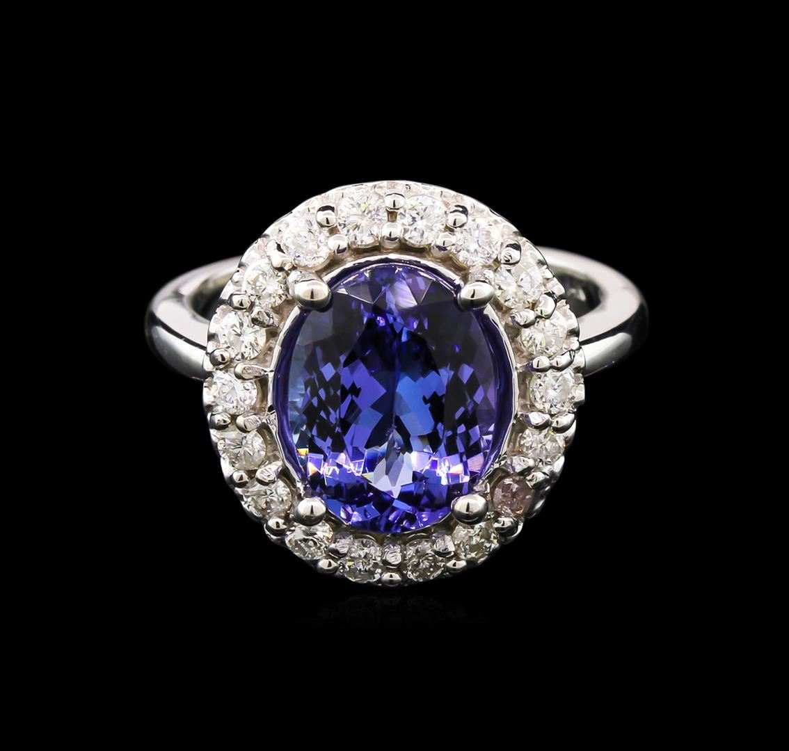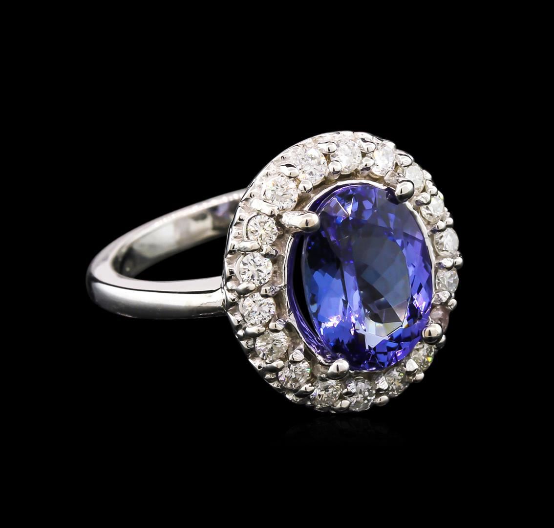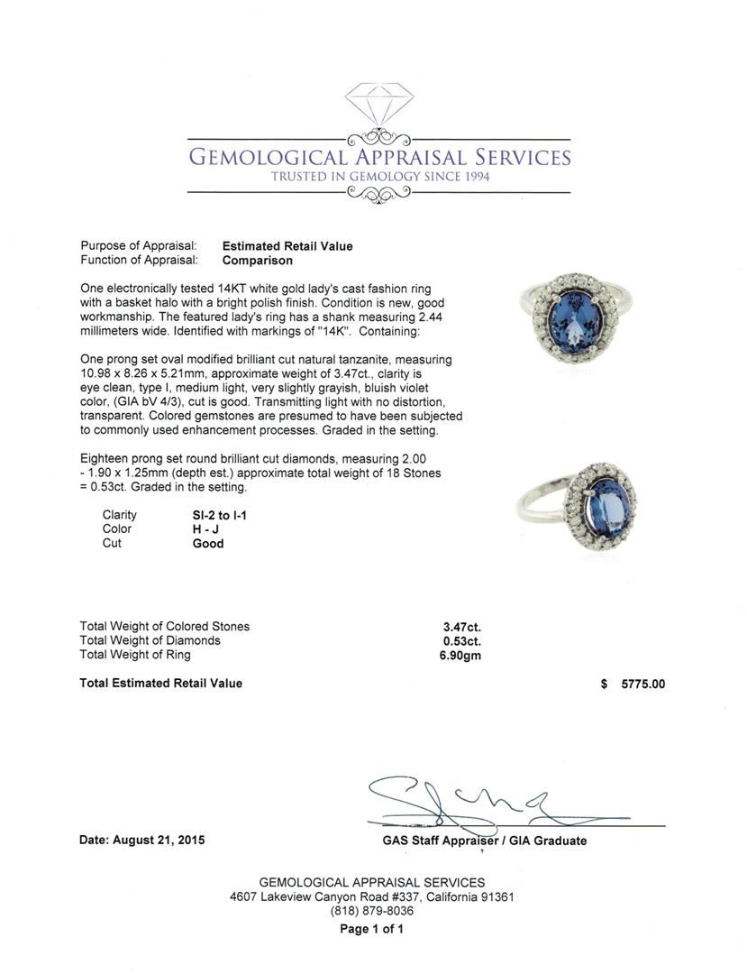 One electronically tested 14KT white gold lady's cast fashion ring with a basket halo with a bright polish finish. The featured lady's ring has a shank measuring 2.44 millimeters wide. Identified with markings of "14K". Condition is new, good workmanship. Containing: One prong set oval modified brilliant cut natural tanzanite, measuring 10.98 x 8.26 x 5.21mm, approximate weight of 3.47ct., clarity is eye clean, type I, medium light, very slightly grayish, bluish violet color, (GIA bV 4/3), cut is good. Transmitting light with no distortion, transparent. Colored gemstones are presumed to have been subjected to commonly used enhancement processes. Graded in the setting. Eighteen prong set round brilliant cut diamonds, measuring 2.00 - 1.90 x 1.25mm (depth est.) approximate total weight of 18 Stones = 0.53ct. Graded in the setting. Clarity: SI-2 to I-1. Color: H - J. Cut Good. Total Weight of Colored Stones 3.47ct. Total Weight of Diamonds 0.53ct. Total Weight of Ring 6.90gm. GAS Appraised at $5,775.00.